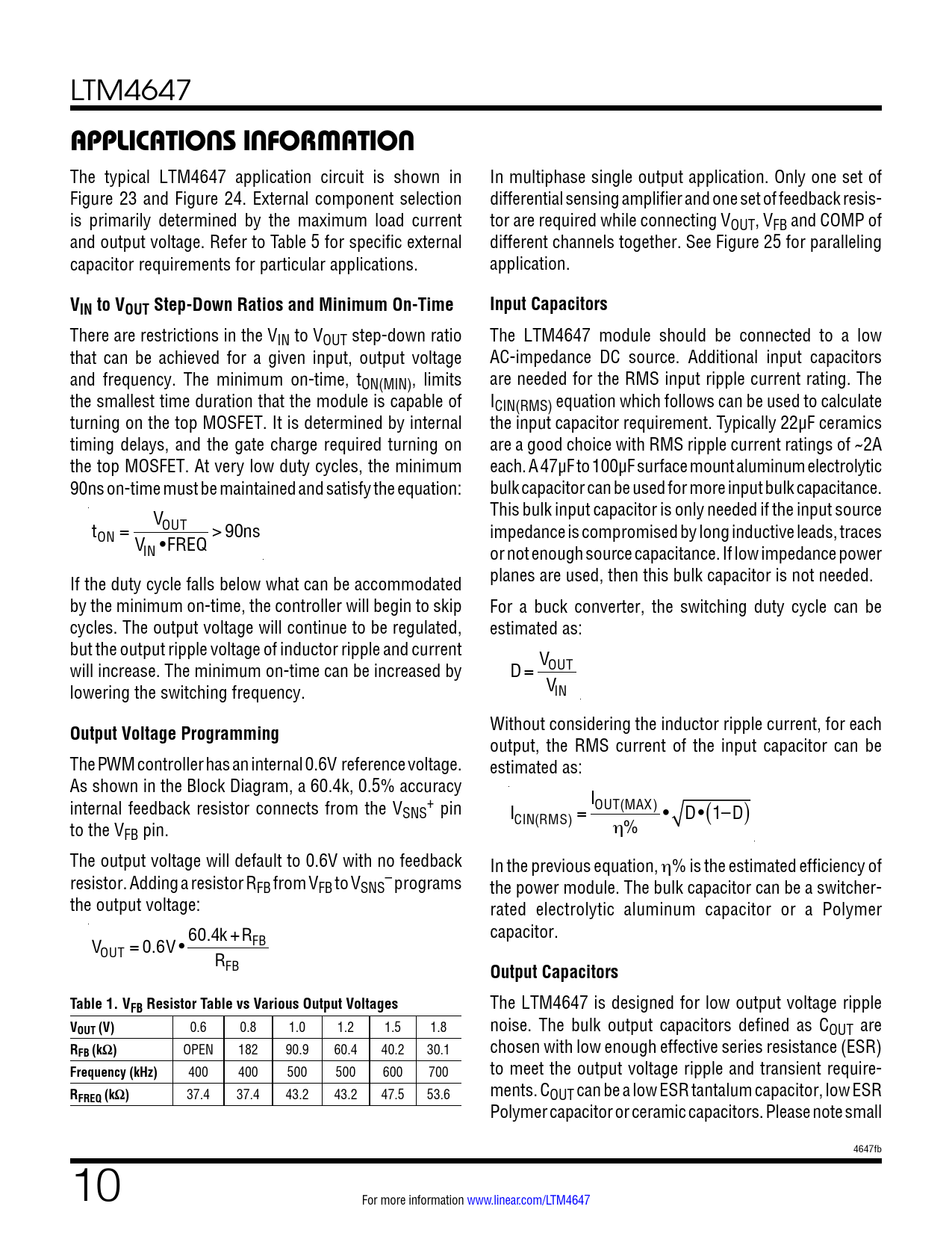 37.4 37.4 43.2 43.2 47.5 53.6 OUT can be a low ESR tantalum capacitor, low ESR Polymer capacitor or ceramic capacitors. Please note small 4647fb 10 For more information www.linear.com/LTM4647 Document Outline Features Applications Description Typical Application Absolute Maximum Ratings Pin Configuration Electrical Characteristics Typical Performance Characteristics Pin Functions Block Diagram Decoupling Requirements Operation Applications Information Typical Applications