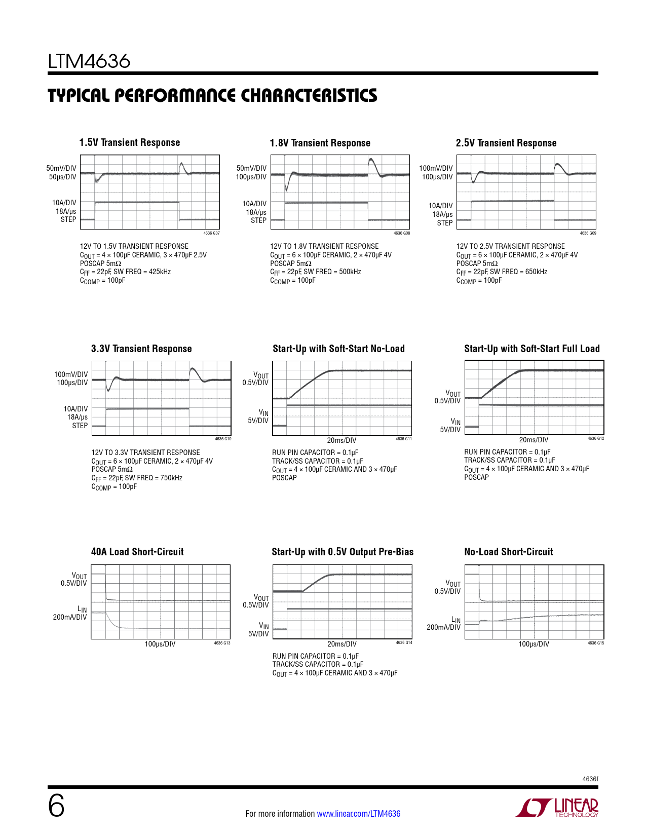 100mV/DIV VOUT 100µs/DIV 0.5V/DIV VOUT 0.5V/DIV 10A/DIV VIN 18A/µs 5V/DIV VIN STEP 5V/DIV 4636 G10 20ms/DIV 4636 G11 20ms/DIV 4636 G12 12V TO 3.3V TRANSIENT RESPONSE RUN PIN CAPACITOR = 0.1µF RUN PIN CAPACITOR = 0.1µF COUT = 6 × 100µF CERAMIC, 2 × 470µF 4V TRACK/SS CAPACITOR = 0.1µF TRACK/SS CAPACITOR = 0.1µF POSCAP 5mΩ COUT = 4 × 100µF CERAMIC AND 3 × 470µF COUT = 4 × 100µF CERAMIC AND 3 × 470µF CFF = 22pF, SW FREQ = 750kHz POSCAP POSCAP CCOMP = 100pF