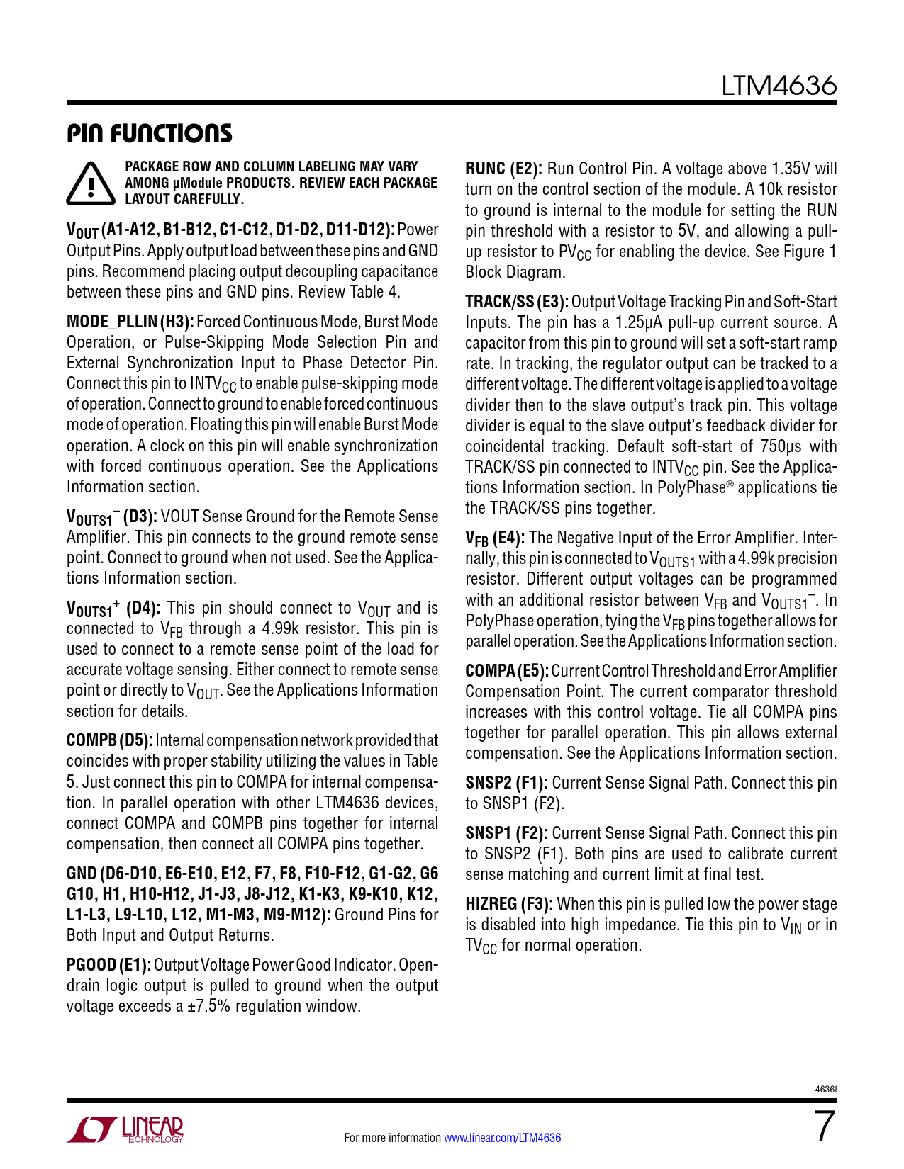 pin FuncTions. PACKAGE ROW AND COLUMN LABELING MAY VARY. RUNC (E2):. AMONG µModule PRODUCTS. REVIEW EACH PACKAGE