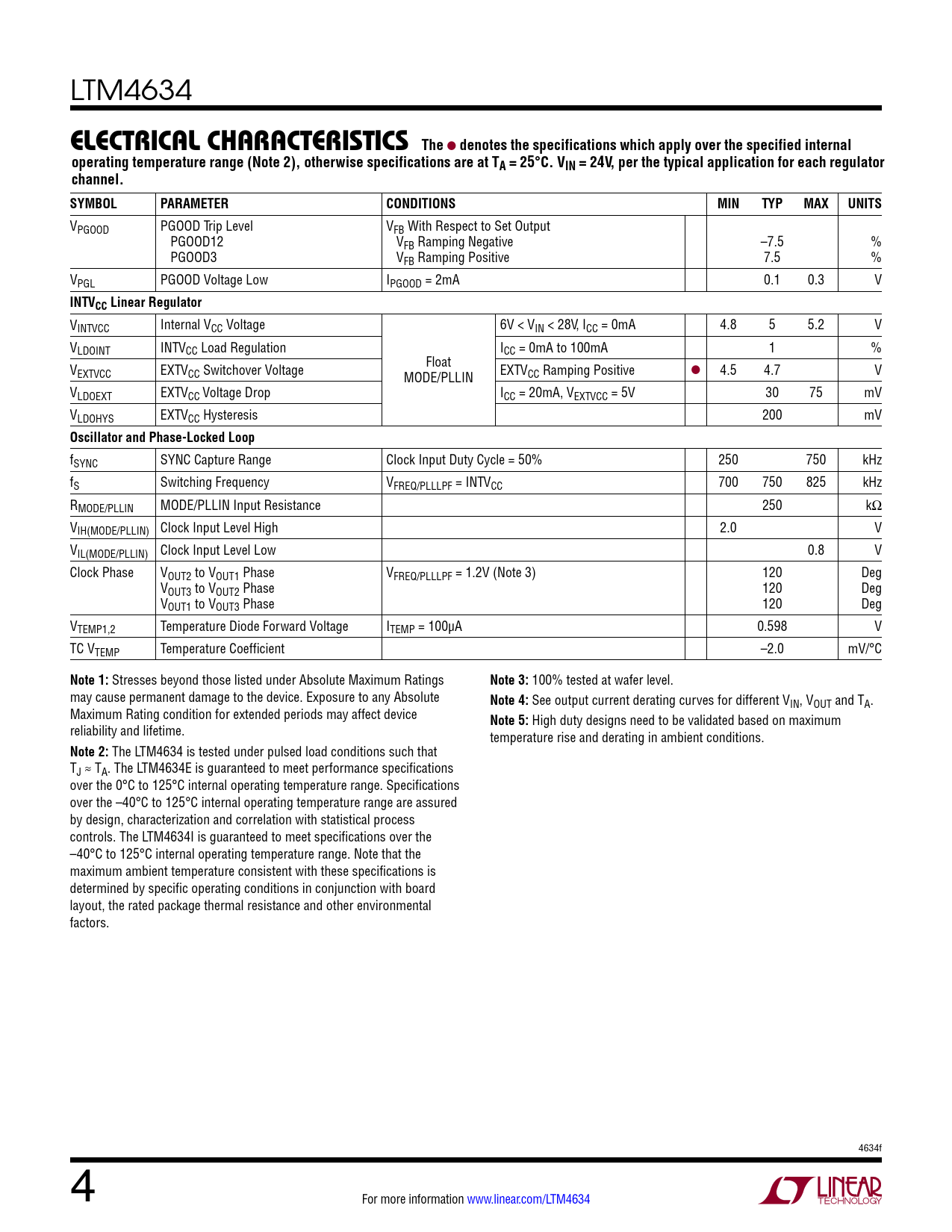The LTM4634 is tested under pulsed load conditions such that TJ ≈ TA. The LTM4634E is guaranteed to meet performance specifications over the 0°C to 125°C internal operating temperature range. Specifications over the –40°C to 125°C internal operating temperature range are assured by design, characterization and correlation with statistical process controls. The LTM4634I is guaranteed to meet specifications over the –40°C to 125°C internal operating temperature range. Note that the maximum ambient temperature consistent with these specifications is determined by specific operating conditions in conjunction with board layout, the rated package thermal resistance and other environmental factors. 4634f 4 For more information www.linear.com/LTM4634 Document Outline Features Applications Description Typical Application Absolute Maximum Ratings Pin Configuration Order Information Electrical Characteristics Typical Performance Characteristics Pin Functions Block Diagram Operation Applications Information Typical Applications Related Parts