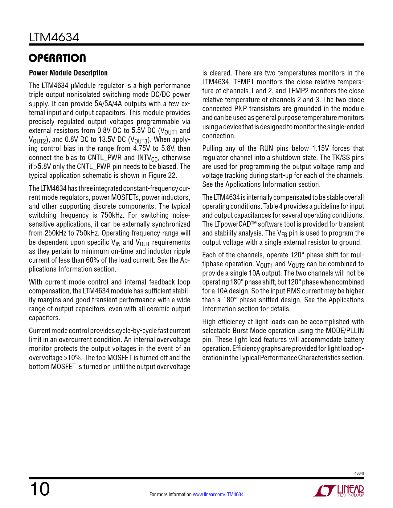 LTM4634 operaTionPower Module Description is cleared. There are two temperatures monitors in the The LTM4634 µModule regulator is a high performance LTM4634. TEMP1 monitors the close relative tempera- triple output nonisolated switching mode DC/DC power ture of channels 1 and 2, and TEMP2 monitors the close supply. It can provide 5A/5A/4A outputs with a few ex- relative temperature of channels 2 and 3. The two diode ternal input and output capacitors. This module provides connected PNP transistors are grounded in the module precisely regulated output voltages programmable via and can be used as general purpose temperature monitors external resistors from 0.8V DC to 5.5V DC (V using a device that is designed to monitor the single-ended OUT1 and V connection. OUT2), and 0.8V DC to 13.5V DC (VOUT3). When apply- ing control bias in the range from 4.75V to 5.8V, then Pulling any of the RUN pins below 1.15V forces that connect the bias to CNTL_PWR and INTVCC, otherwise regulator channel into a shutdown state. The TK/SS pins if >5.8V only the CNTL_PWR pin needs to be biased. The are used for programming the output voltage ramp and typical application schematic is shown in Figure 22. voltage tracking during start-up for each of the channels. The LTM4634 has three integrated constant-frequency cur- See the Applications Information section. rent mode regulators, power MOSFETs, power inductors, The LTM4634 is internally compensated to be stable over all and other supporting discrete components. The typical operating conditions. Table 4 provides a guideline for input switching frequency is 750kHz. For switching noise- and output capacitances for several operating conditions. sensitive applications, it can be externally synchronized The LTpowerCAD™ software tool is provided for transient from 250kHz to 750kHz. Operating frequency range will and stability analysis. The VFB pin is used to program the be dependent upon specific VIN and VOUT requirements output voltage with a single external resistor to ground. as they pertain to minimum on-time and inductor ripple Each of the channels, operate 120° phase shift for mul- current of less than 60% of the load current. See the Ap- tiphase operation. V plications Information section. OUT1 and VOUT2 can be combined to provide a single 10A output. The two channels will not be With current mode control and internal feedback loop operating 180° phase shift, but 120° phase when combined compensation, the LTM4634 module has sufficient stabil- for a 10A design. So the input RMS current may be higher ity margins and good transient performance with a wide than a 180° phase shifted design. See the Applications range of output capacitors, even with all ceramic output Information section for details. capacitors. High efficiency at light loads can be accomplished with Current mode control provides cycle-by-cycle fast current selectable Burst Mode operation using the MODE/PLLIN limit in an overcurrent condition. An internal overvoltage pin. These light load features will accommodate battery monitor protects the output voltages in the event of an operation. Efficiency graphs are provided for light load op- overvoltage >10%. The top MOSFET is turned off and the eration in the Typical Performance Characteristics section. bottom MOSFET is turned on until the output overvoltage 4634f 10 For more information www.linear.com/LTM4634 Document Outline Features Applications Description Typical Application Absolute Maximum Ratings Pin Configuration Order Information Electrical Characteristics Typical Performance Characteristics Pin Functions Block Diagram Operation Applications Information Typical Applications Related Parts