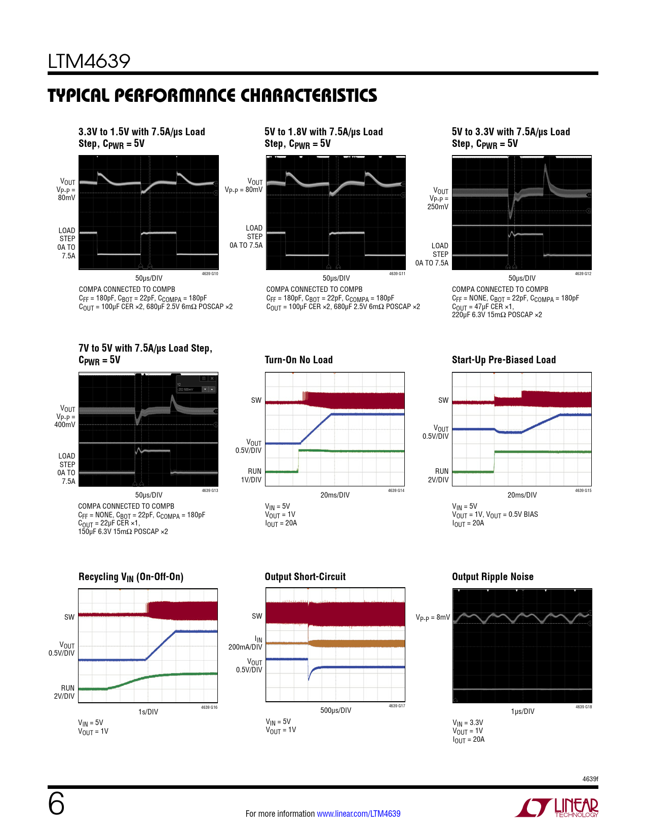VOUT VOUT VP-P = VP-P = 80mV VOUT 80mV VP-P = 250mV LOAD LOAD STEP STEP 0A TO 0A TO 7.5A LOAD 7.5A STEP 0A TO 7.5A 50µs/DIV 4639 G10 50µs/DIV 4639 G11 50µs/DIV 4639 G12 COMPA CONNECTED TO COMPB COMPA CONNECTED TO COMPB COMPA CONNECTED TO COMPB CFF = 180pF, CBOT = 22pF, CCOMPA = 180pF CFF = 180pF, CBOT = 22pF, CCOMPA = 180pF CFF = NONE, CBOT = 22pF, CCOMPA = 180pF COUT = 100µF CER ×2, 680µF 2.5V 6mΩ POSCAP ×2 COUT = 100µF CER ×2, 680µF 2.5V 6mΩ POSCAP ×2 COUT = 47µF CER ×1, 220µF 6.3V 15mΩ POSCAP ×2