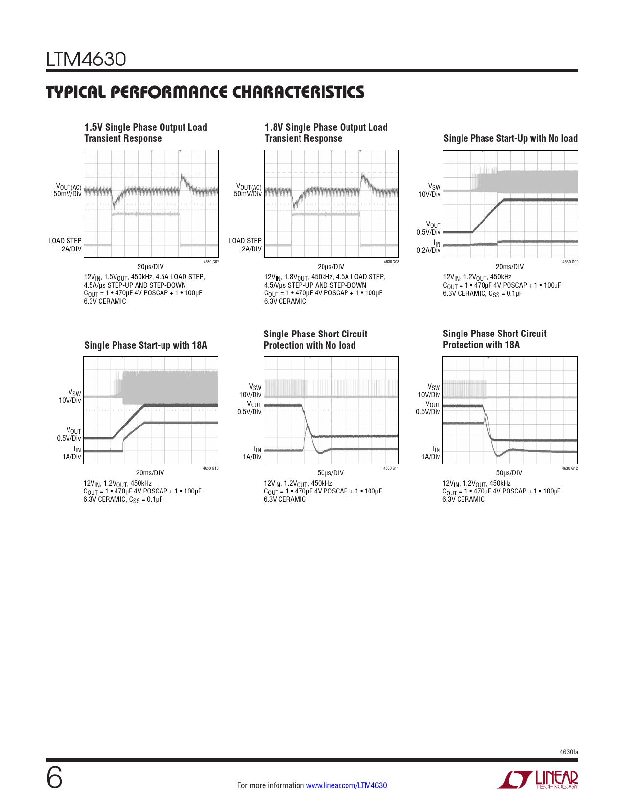 V V V SW SW SW 10V/Div 10V/Div 10V/Div VOUT VOUT 0.5V/Div 0.5V/Div VOUT 0.5V/Div IIN IIN IIN 1A/Div 1A/Div 1A/Div 4630 G10 4630 G11 4630 G12 20ms/DIV 50µs/DIV 50µs/DIV 12VIN, 1.2VOUT, 450kHz 12VIN, 1.2VOUT, 450kHz 12VIN, 1.2VOUT, 450kHz COUT = 1 • 470µF 4V POSCAP + 1 • 100µF COUT = 1 • 470µF 4V POSCAP + 1 • 100µF COUT = 1 • 470µF 4V POSCAP + 1 • 100µF 6.3V CERAMIC, CSS = 0.1µF 6.3V CERAMIC 6.3V CERAMIC 4630fa 6 For more information www.linear.com/LTM4630 Document Outline Description Typical Application Absolute Maximum Ratings Pin Configuration Electrical Characteristics Typical Performance Characteristics Pin Functions Operation Applications Information Package Description Related Parts