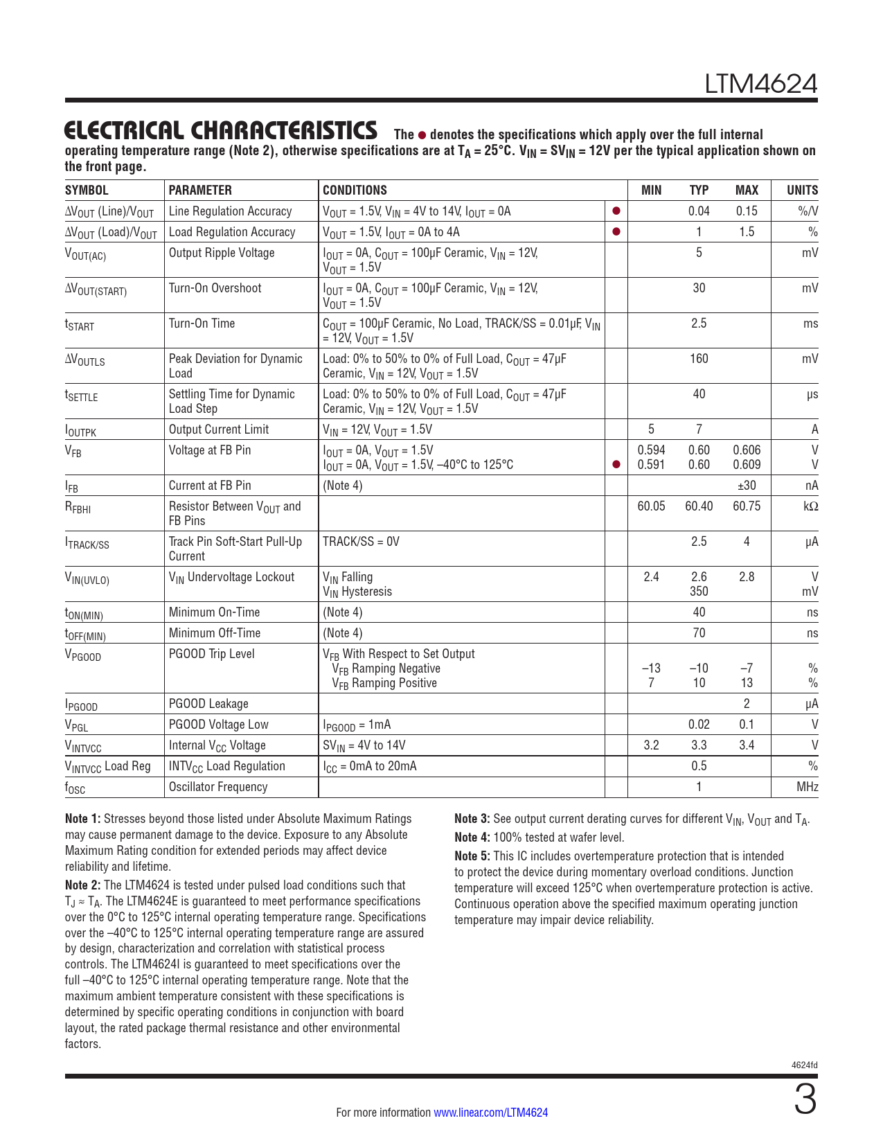 LTM4624 ELECTRICAL CHARACTERISTICSThe l denotes the specifications which apply over the full internaloperating temperature range (Note 2), otherwise specifications are at TA = 25°C. VIN = SVIN = 12V per the typical application shown onthe front page. SYMBOLPARAMETERCONDITIONSMINTYPMAXUNITS ΔVOUT (Line)/VOUT Line Regulation Accuracy VOUT = 1.5V, VIN = 4V to 14V, IOUT = 0A l 0.04 0.15 %/V ΔVOUT (Load)/VOUT Load Regulation Accuracy VOUT = 1.5V, IOUT = 0A to 4A l 1 1.5 % VOUT(AC) Output Ripple Voltage IOUT = 0A, COUT = 100µF Ceramic, VIN = 12V, 5 mV VOUT = 1.5V ΔVOUT(START) Turn-On Overshoot IOUT = 0A, COUT = 100µF Ceramic, VIN = 12V, 30 mV VOUT = 1.5V tSTART Turn-On Time COUT = 100µF Ceramic, No Load, TRACK/SS = 0.01µF, VIN 2.5 ms = 12V, VOUT = 1.5V ΔVOUTLS Peak Deviation for Dynamic Load: 0% to 50% to 0% of Full Load, COUT = 47µF 160 mV Load Ceramic, VIN = 12V, VOUT = 1.5V tSETTLE Settling Time for Dynamic Load: 0% to 50% to 0% of Full Load, COUT = 47µF 40 µs Load Step Ceramic, VIN = 12V, VOUT = 1.5V IOUTPK Output Current Limit VIN = 12V, VOUT = 1.5V 5 7 A VFB Voltage at FB Pin IOUT = 0A, VOUT = 1.5V 0.594 0.60 0.606 V IOUT = 0A, VOUT = 1.5V, –40°C to 125°C l 0.591 0.60 0.609 V IFB Current at FB Pin (Note 4) ±30 nA RFBHI Resistor Between VOUT and 60.05 60.40 60.75 kΩ FB Pins ITRACK/SS Track Pin Soft-Start Pull-Up TRACK/SS = 0V 2.5 4 µA Current VIN(UVLO) VIN Undervoltage Lockout VIN Falling 2.4 2.6 2.8 V VIN Hysteresis 350 mV tON(MIN) Minimum On-Time (Note 4) 40 ns tOFF(MIN) Minimum Off-Time (Note 4) 70 ns VPGOOD PGOOD Trip Level VFB With Respect to Set Output VFB Ramping Negative –13 –10 –7 % VFB Ramping Positive 7 10 13 % IPGOOD PGOOD Leakage 2 µA VPGL PGOOD Voltage Low IPGOOD = 1mA 0.02 0.1 V VINTVCC Internal VCC Voltage SVIN = 4V to 14V 3.2 3.3 3.4 V VINTVCC Load Reg INTVCC Load Regulation ICC = 0mA to 20mA 0.5 % fOSC Oscillator Frequency 1 MHz Note 1: Stresses beyond those listed under Absolute Maximum Ratings Note 3: See output current derating curves for different VIN, VOUT and TA. may cause permanent damage to the device. Exposure to any Absolute Note 4: 100% tested at wafer level. Maximum Rating condition for extended periods may affect device Note 5: This IC includes overtemperature protection that is intended reliability and lifetime. to protect the device during momentary overload conditions. Junction Note 2: The LTM4624 is tested under pulsed load conditions such that temperature will exceed 125°C when overtemperature protection is active. TJ ≈ TA. The LTM4624E is guaranteed to meet performance specifications Continuous operation above the specified maximum operating junction over the 0°C to 125°C internal operating temperature range. Specifications temperature may impair device reliability. over the –40°C to 125°C internal operating temperature range are assured by design, characterization and correlation with statistical process controls. The LTM4624I is guaranteed to meet specifications over the full –40°C to 125°C internal operating temperature range. Note that the maximum ambient temperature consistent with these specifications is determined by specific operating conditions in conjunction with board layout, the rated package thermal resistance and other environmental factors. 4624fd For more information www.linear.com/LTM4624 3 Document Outline Features Applications Description Typical Application Absolute Maximum Ratings Pin Configuration Order Information Electrical Characteristics Typical Performance Characteristics Pin Functions Block Diagram Decoupling Requirements Operation Applications Information Package Description Package Photo Design Resources Related Parts