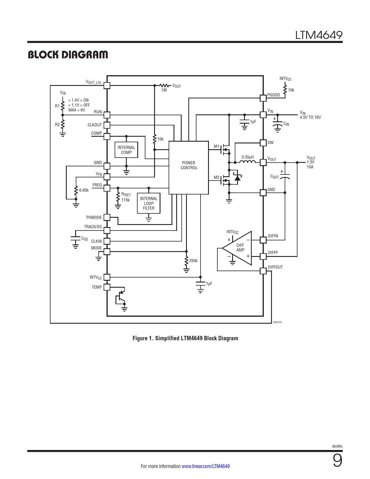 LTM4649 BLOCK DIAGRAM INTV V CC OUT_LCL VOUT V 1M 10k IN PGOOD > 1.4V = ON R1 < 1.1V = OFF MAX = 6V RUN VIN VIN 4.5V TO 16V + 1µF R2 CLKOUT CIN COMP 10k SW M1 INTERNAL COMP 0.35µH V V OUT OUT GND POWER 1.5V CONTROL 10A + VFB M2 COUT FREQ 6.65k GND RfSET 115k INTERNAL LOOP FILTER PHMODE TRACK/SS INTVCC C + – DIFFN SS CLKIN DIFF MODE – AMP + DIFFP 250k DIFFOUT INTVCC 1µF TEMP 4649 F01 Figure 1. Simplified LTM4649 Block Diagram 4649fc For more information www.linear.com/LTM4649 9 Document Outline Features Applications Description Typical Application Absolute Maximum Ratings Pin Configuration Order Information Electrical Characteristics Typical Performance Characteristics Pin Functions Block Diagram Operation Applications Information Typical Applications Package Description Package Photo Revision History Typical Application Design Resources Related Parts