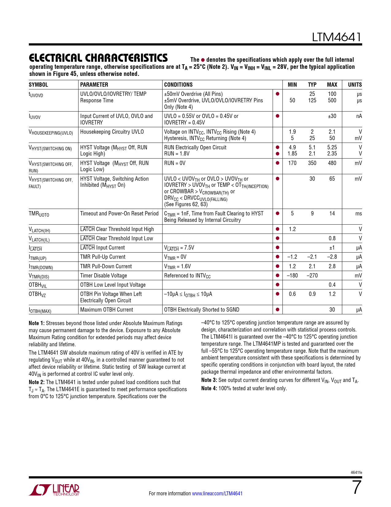 See output current derating curves for different VIN, VOUT and TA. TJ ≈ TA. The LTM4641E is guaranteed to meet performance specifications
