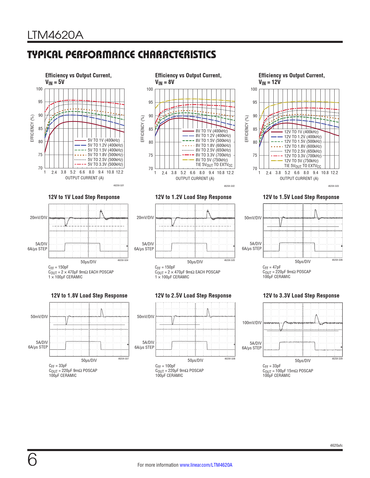 50mV/DIV 50mV/DIV 100mV/DIV 5A/DIV 5A/DIV 5A/DIV 6A/µs STEP 6A/µs STEP 6A/µs STEP 50µs/DIV 4620A G07 50µs/DIV 4620A G08 50µs/DIV 4620A G09 CFF = 33pF CFF = 100pF CFF = 33pF COUT = 220µF 9mΩ POSCAP COUT = 220µF 9mΩ POSCAP COUT = 100µF 15mΩ POSCAP 100µF CERAMIC 100µF CERAMIC 100µF CERAMIC 4620afc 6 For more information www.linear.com/LTM4620A Document Outline Features Applications Description Typical Application Absolute Maximum Ratings Pin Configuration Order Information Typical Performance Characteristics Pin Functions Simplified Block Diagram Decoupling Requirements Operation Applications Information Typical Applications Package Description Package Photo Related Parts Design Resources