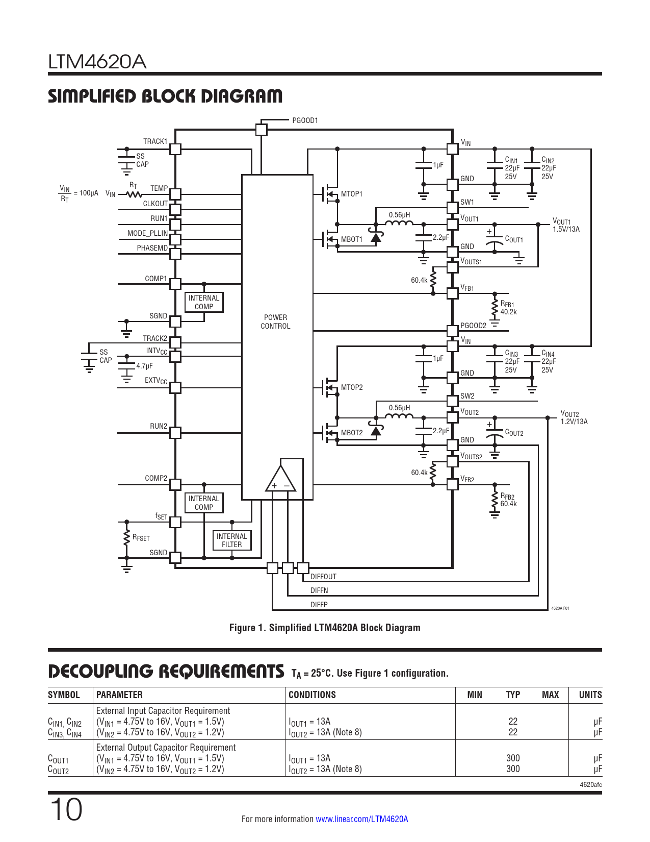 Figure 1. Simplified LTM4620A Block Diagram DECOUPLING REQUIREMENTS TA = 25°C. Use Figure 1 configuration. SYMBOL PARAMETER CONDITIONS MIN TYP MAX UNITS