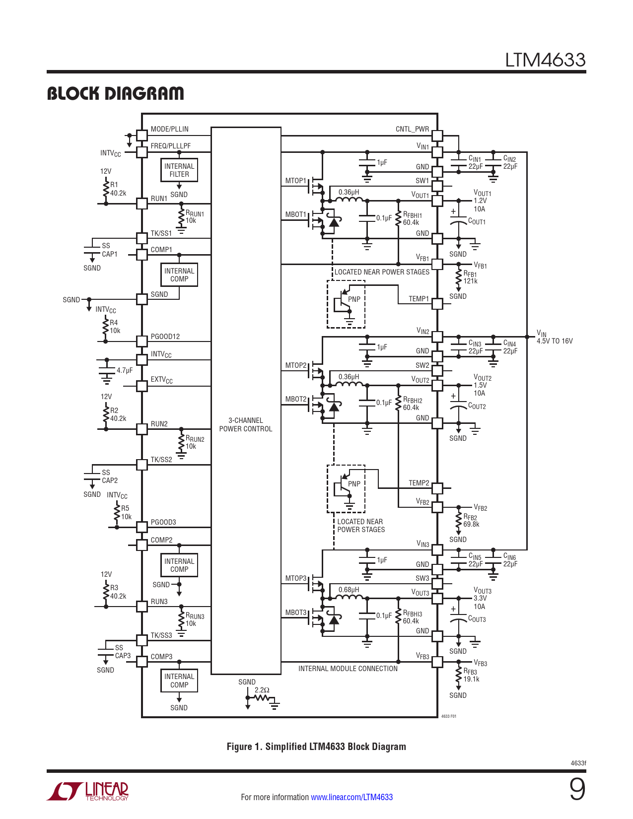 MODE/PLLIN CNTL_PWR FREQ/PLLLPF VIN1 INTVCC 1µF CIN1 CIN2 INTERNAL GND 22µF 22µF 12V FILTER MTOP1 SW1 R1 40.2k 0.36µH SGND VOUT1 VOUT1 RUN1 1.2V RRUN1 R + 10A MBOT1 0.1µF FBHI1 10k 60.4k COUT1 TK/SS1 GND SS COMP1 CAP1 SGND VFB1 VFB1 SGND INTERNAL LOCATED NEAR POWER STAGES RFB1 COMP 121k SGND SGND SGND PNP TEMP1 INTVCC R4 10k VIN2 VIN PGOOD12 4.5V TO 16V 1µF CIN3 CIN4 GND 22µF 22µF INTVCC MTOP2 SW2 4.7µF 0.36µH EXTV V CC OUT2 VOUT2 1.5V 10A 12V MBOT2 + 0.1µF RFBHI2 60.4k COUT2 R2 40.2k GND RUN2 3-CHANNEL POWER CONTROL RRUN2 SGND 10k TK/SS2 SS CAP2 PNP TEMP2 SGND INTVCC VFB2 R5 VFB2 10k R PGOOD3 LOCATED NEAR FB2 69.8k POWER STAGES COMP2 SGND VIN3 INTERNAL 1µF CIN5 CIN6 GND 22µF 22µF COMP 12V MTOP3 SW3 R3 SGND 0.68µH VOUT3 VOUT3 40.2k RUN3 3.3V 10A MBOT3 + RRUN3 0.1µF RFBHI3 60.4k C 10k OUT3 GND TK/SS3 SS CAP3 SGND COMP3 VFB3 VFB3 SGND INTERNAL MODULE CONNECTION RFB3 INTERNAL 19.1k SGND COMP 2.2Ω SGND SGND 4633 F01