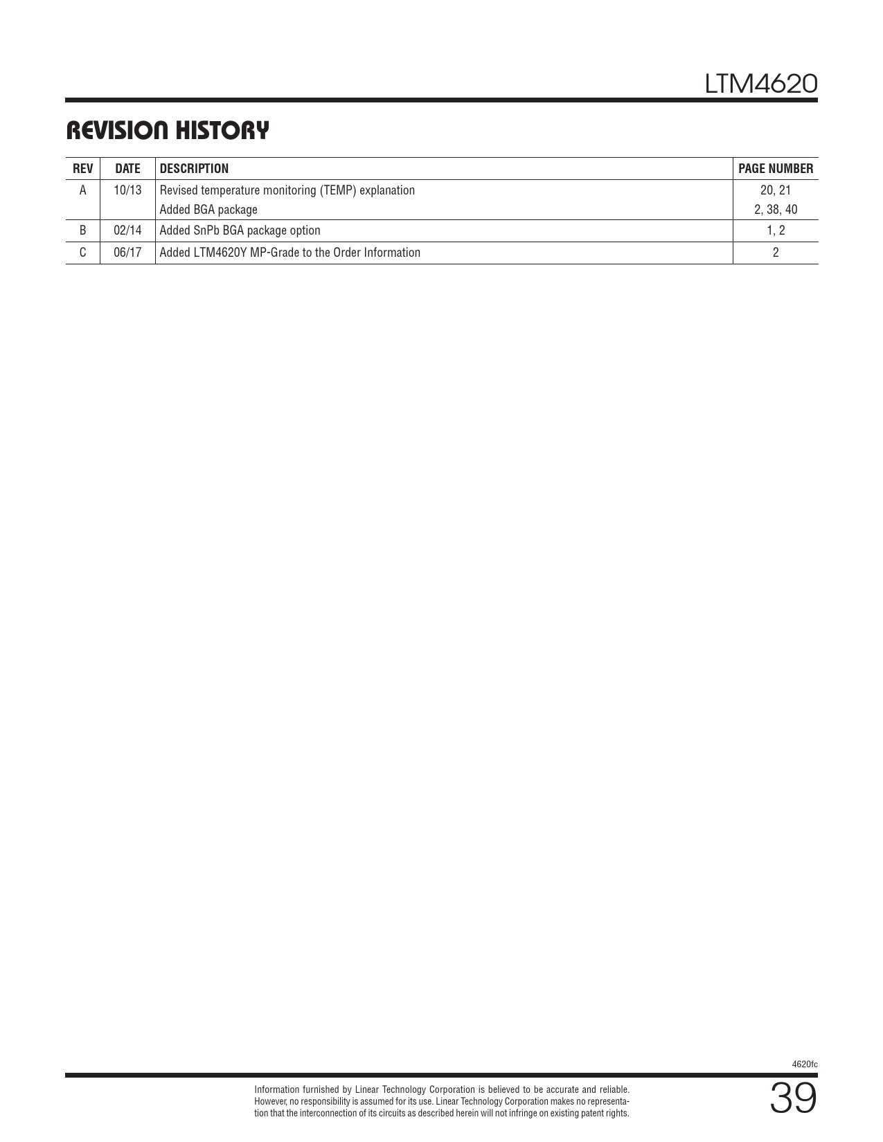 LTM4620 REVISION HISTORYREVDATEDESCRIPTIONPAGE NUMBER A 10/13 Revised temperature monitoring (TEMP) explanation 20, 21 Added BGA package 2, 38, 40 B 02/14 Added SnPb BGA package option 1, 2 C 06/17 Added LTM4620Y MP-Grade to the Order Information 2 4620fc Information furnished by Linear Technology Corporation is believed to be accurate and reliable. However, no responsibility is assumed for its use. Linear Technology Corporation makes no representa- tion that the inter For more inf connection of its cir ormation www.linear.com/LTM4620 cuits as described herein will not infringe on existing patent rights. 39 Document Outline Features Applications Description Typical Application Absolute Maximum Ratings Pin Configuration Order Information Typical Performance Characteristics Pin Functions Simplified Block Diagram Decoupling Requirements Operation Applications Information Typical Applications Package Description Package Photo Related Parts