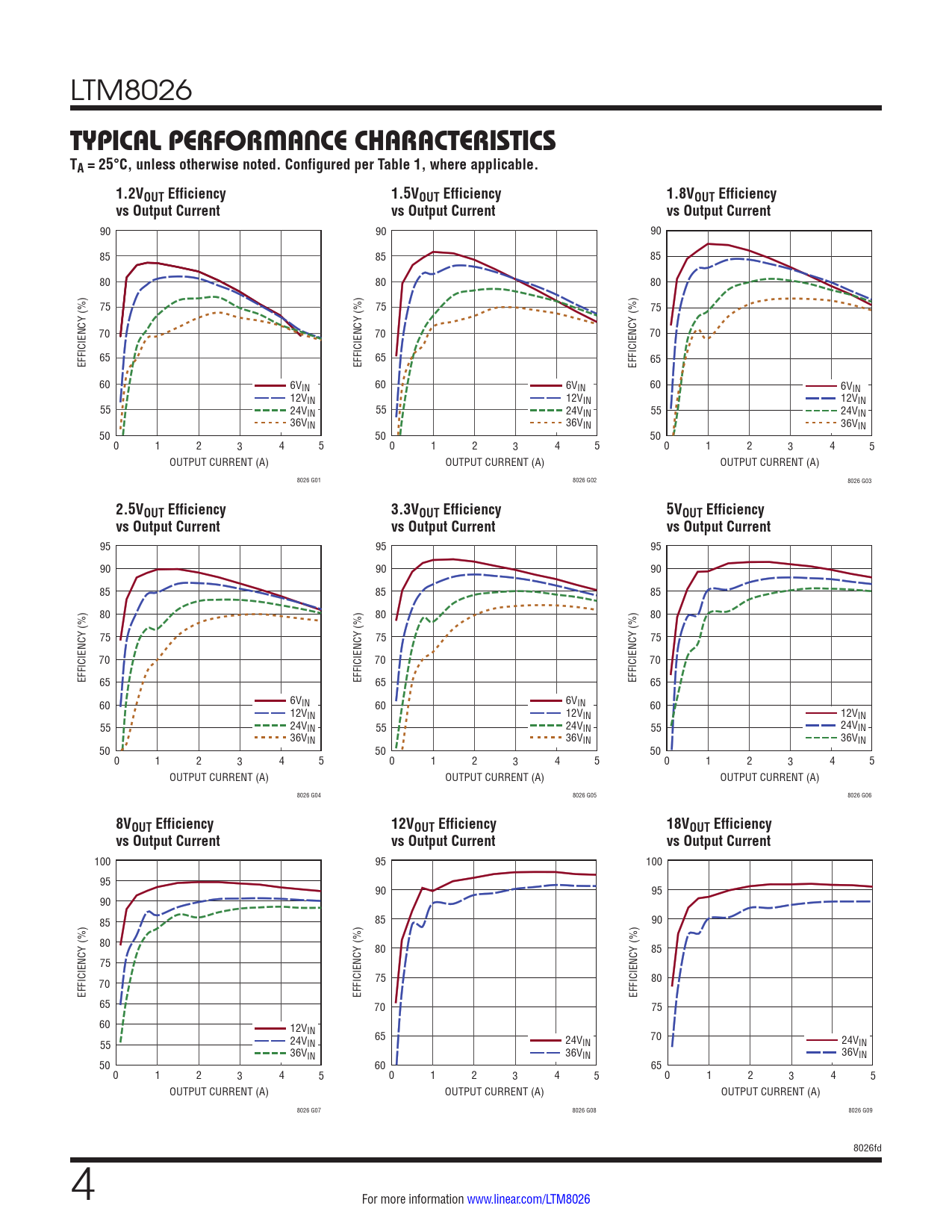 90 90 90 85 85 85 80 80 80 75 75 75 70 70 70 EFFICIENCY (%) 65 EFFICIENCY (%) 65 EFFICIENCY (%) 65 60 6VIN 60 6VIN 60 6VIN 12VIN 12VIN 12VIN 55 24VIN 55 24VIN 55 24VIN 36VIN 36VIN 36VIN 50 50 50 0 1 2 3 4 5 0 1 2 3 4 5 0 1 2 3 4 5 OUTPUT CURRENT (A) OUTPUT CURRENT (A) OUTPUT CURRENT (A) 8026 G01 8026 G02 8026 G03