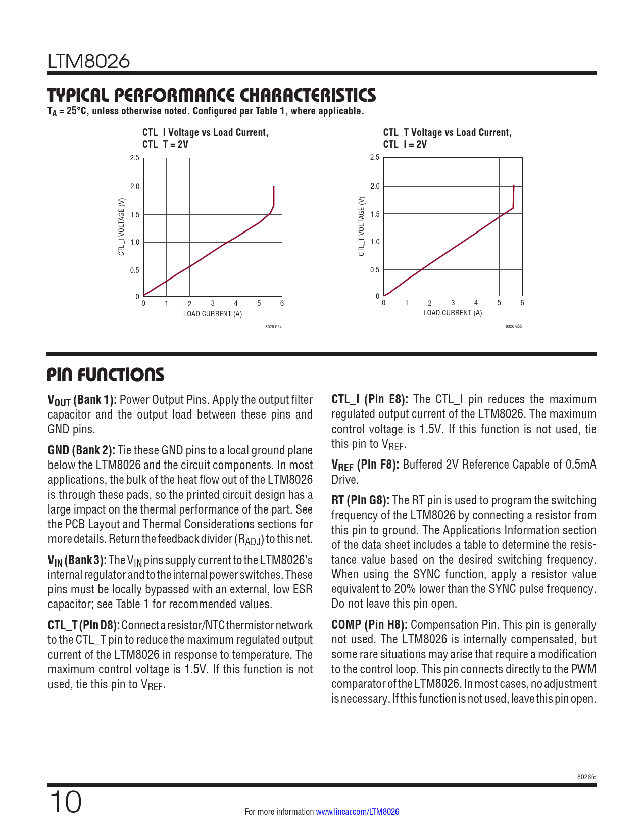 LTM8026 TYPICAL PERFORMANCE CHARACTERISTICSTA = 25°C, unless otherwise noted. Configured per Table 1, where applicable.CTL_I Voltage vs Load Current,CTL_T Voltage vs Load Current,CTL_T = 2VCTL_I = 2V 2.5 2.5 2.0 2.0 1.5 1.5 1.0 1.0 CTL_I VOLTAGE (V) CTL_T VOLTAGE (V) 0.5 0.5 0 0 0 1 2 3 4 5 6 0 1 2 3 4 5 6 LOAD CURRENT (A) LOAD CURRENT (A) 8026 G54 8026 G55 PIN FUNCTIONSVOUT (Bank 1): Power Output Pins. Apply the output filter CTL_I (Pin E8): The CTL_I pin reduces the maximum capacitor and the output load between these pins and regulated output current of the LTM8026. The maximum GND pins. control voltage is 1.5V. If this function is not used, tie GND (Bank 2): Tie these GND pins to a local ground plane this pin to VREF . below the LTM8026 and the circuit components. In most VREF (Pin F8): Buffered 2V Reference Capable of 0.5mA applications, the bulk of the heat flow out of the LTM8026 Drive. is through these pads, so the printed circuit design has a RT (Pin G8): The RT pin is used to program the switching large impact on the thermal performance of the part. See frequency of the LTM8026 by connecting a resistor from the PCB Layout and Thermal Considerations sections for this pin to ground. The Applications Information section more details. Return the feedback divider (RADJ) to this net. of the data sheet includes a table to determine the resis- VIN (Bank 3): The VIN pins supply current to the LTM8026’s tance value based on the desired switching frequency. internal regulator and to the internal power switches. These When using the SYNC function, apply a resistor value pins must be locally bypassed with an external, low ESR equivalent to 20% lower than the SYNC pulse frequency. capacitor; see Table 1 for recommended values. Do not leave this pin open. CTL_T (Pin D8): Connect a resistor/NTC thermistor network COMP (Pin H8): Compensation Pin. This pin is generally to the CTL_T pin to reduce the maximum regulated output not used. The LTM8026 is internally compensated, but current of the LTM8026 in response to temperature. The some rare situations may arise that require a modification maximum control voltage is 1.5V. If this function is not to the control loop. This pin connects directly to the PWM used, tie this pin to VREF . comparator of the LTM8026. In most cases, no adjustment is necessary. If this function is not used, leave this pin open. 8026fd 10 For more information www.linear.com/LTM8026 Document Outline Features Applications Description Typical Application Absolute Maximum Ratings Pin Configuration Electrical Characteristics Typical Performance Characteristics Pin Functions Block Diagram Operation Applications Information Typical Applications Package Description Package Photo Package Description Revision History Typical Application Design Resources Related Parts
