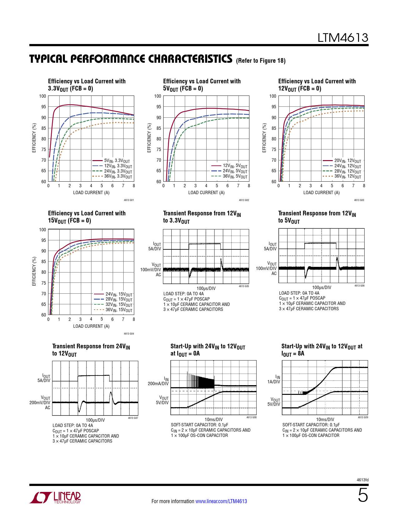 100 95 IOUT IOUT 90 5A/DIV 5A/DIV 85 V V OUT OUT 100mV/DIV 80 100mV/DIV AC AC EFFICIENCY (%) 75 100µs/DIV 4613 G05 100µs/DIV 4613 G06 70 24VIN, 15VOUT LOAD STEP: 0A TO 4A LOAD STEP: 0A TO 4A 28VIN, 15VOUT COUT = 1 × 47µF POSCAP COUT = 1 × 47µF POSCAP 65 32VIN, 15VOUT 1 × 10µF CERAMIC CAPACITOR AND 1 × 10µF CERAMIC CAPACITOR AND 36VIN, 15VOUT 3 × 47µF CERAMIC CAPACITORS 3 × 47µF CERAMIC CAPACITORS 60 0 1 2 3 4 5 6 7 8 LOAD CURRENT (A) 4613 G04