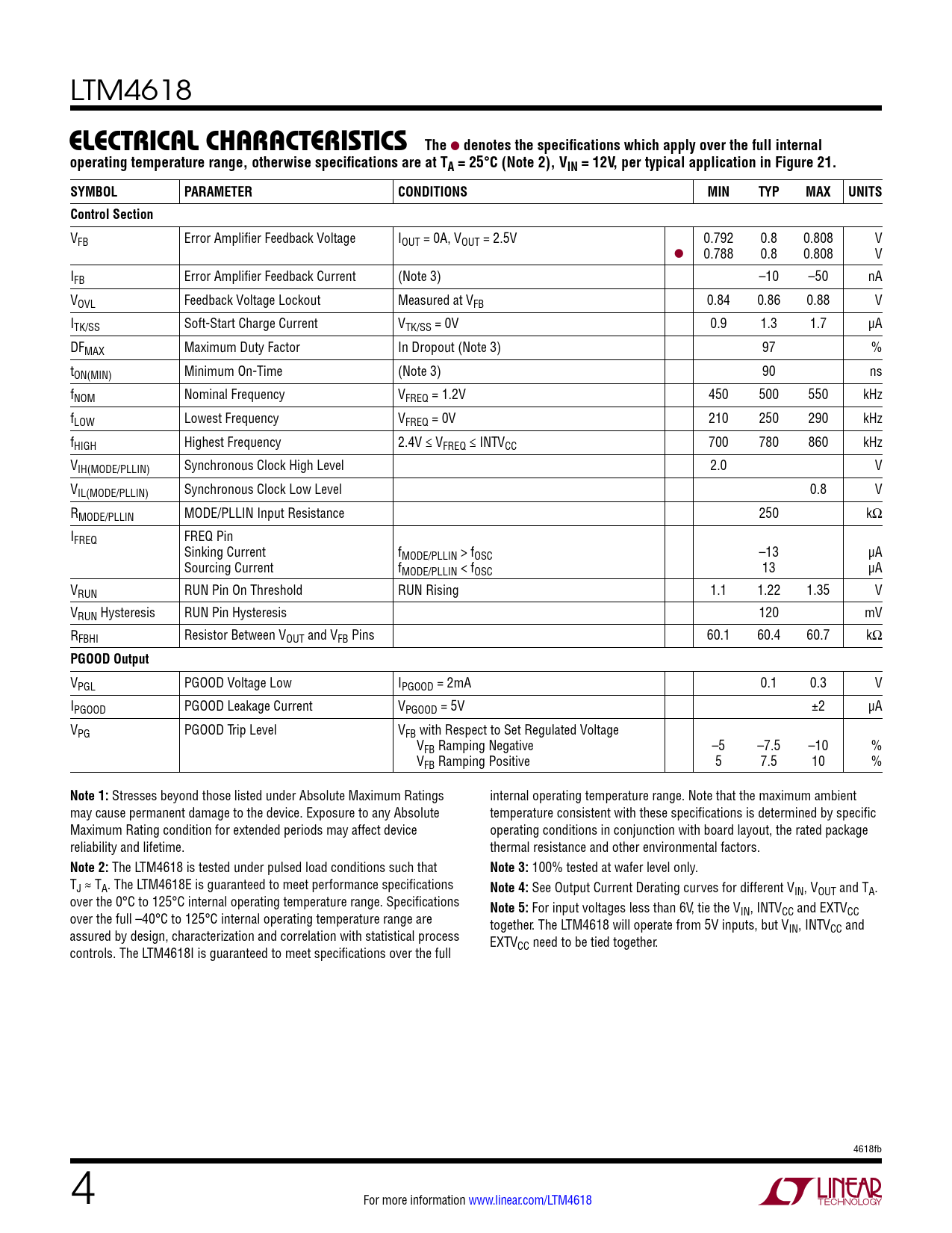 LTM4618 elecTrical characTerisTicsThe l denotes the specifications which apply over the full internaloperating temperature range, otherwise specifications are at TA = 25°C (Note 2), VIN = 12V, per typical application in Figure 21. SYMBOLPARAMETERCONDITIONSMINTYPMAXUNITSControl Section VFB Error Amplifier Feedback Voltage IOUT = 0A, VOUT = 2.5V 0.792 0.8 0.808 V l 0.788 0.8 0.808 V IFB Error Amplifier Feedback Current (Note 3) –10 –50 nA VOVL Feedback Voltage Lockout Measured at VFB 0.84 0.86 0.88 V ITK/SS Soft-Start Charge Current VTK/SS = 0V 0.9 1.3 1.7 µA DFMAX Maximum Duty Factor In Dropout (Note 3) 97 % tON(MIN) Minimum On-Time (Note 3) 90 ns fNOM Nominal Frequency VFREQ = 1.2V 450 500 550 kHz fLOW Lowest Frequency VFREQ = 0V 210 250 290 kHz fHIGH Highest Frequency 2.4V ≤ VFREQ ≤ INTVCC 700 780 860 kHz VIH(MODE/PLLIN) Synchronous Clock High Level 2.0 V VIL(MODE/PLLIN) Synchronous Clock Low Level 0.8 V RMODE/PLLIN MODE/PLLIN Input Resistance 250 kΩ IFREQ FREQ Pin Sinking Current fMODE/PLLIN > fOSC –13 µA Sourcing Current fMODE/PLLIN < fOSC 13 µA VRUN RUN Pin On Threshold RUN Rising 1.1 1.22 1.35 V VRUN Hysteresis RUN Pin Hysteresis 120 mV RFBHI Resistor Between VOUT and VFB Pins 60.1 60.4 60.7 kΩ PGOOD Output VPGL PGOOD Voltage Low IPGOOD = 2mA 0.1 0.3 V IPGOOD PGOOD Leakage Current VPGOOD = 5V ±2 µA VPG PGOOD Trip Level VFB with Respect to Set Regulated Voltage VFB Ramping Negative –5 –7.5 –10 % VFB Ramping Positive 5 7.5 10 % Note 1: Stresses beyond those listed under Absolute Maximum Ratings internal operating temperature range. Note that the maximum ambient may cause permanent damage to the device. Exposure to any Absolute temperature consistent with these specifications is determined by specific Maximum Rating condition for extended periods may affect device operating conditions in conjunction with board layout, the rated package reliability and lifetime. thermal resistance and other environmental factors. Note 2: The LTM4618 is tested under pulsed load conditions such that Note 3: 100% tested at wafer level only. TJ ≈ TA. The LTM4618E is guaranteed to meet performance specifications Note 4: See Output Current Derating curves for different VIN, VOUT and TA. over the 0°C to 125°C internal operating temperature range. Specifications Note 5: For input voltages less than 6V, tie the V over the full –40°C to 125°C internal operating temperature range are IN, INTVCC and EXTVCC together. The LTM4618 will operate from 5V inputs, but V assured by design, characterization and correlation with statistical process IN, INTVCC and EXTV controls. The LTM4618I is guaranteed to meet specifications over the full CC need to be tied together. 4618fb 4 For more information www.linear.com/LTM4618 Document Outline Features Description Applications Typical Application Absolute Maximum Ratings Pin Configuration Order Information Electrical Characteristics Typical Performance Characteristics Pin Functions Simplified Block Diagram Decoupling Requirements Operation Applications Information Typical Applications Package Photograph Package Description Revision History Typical Application Related Parts