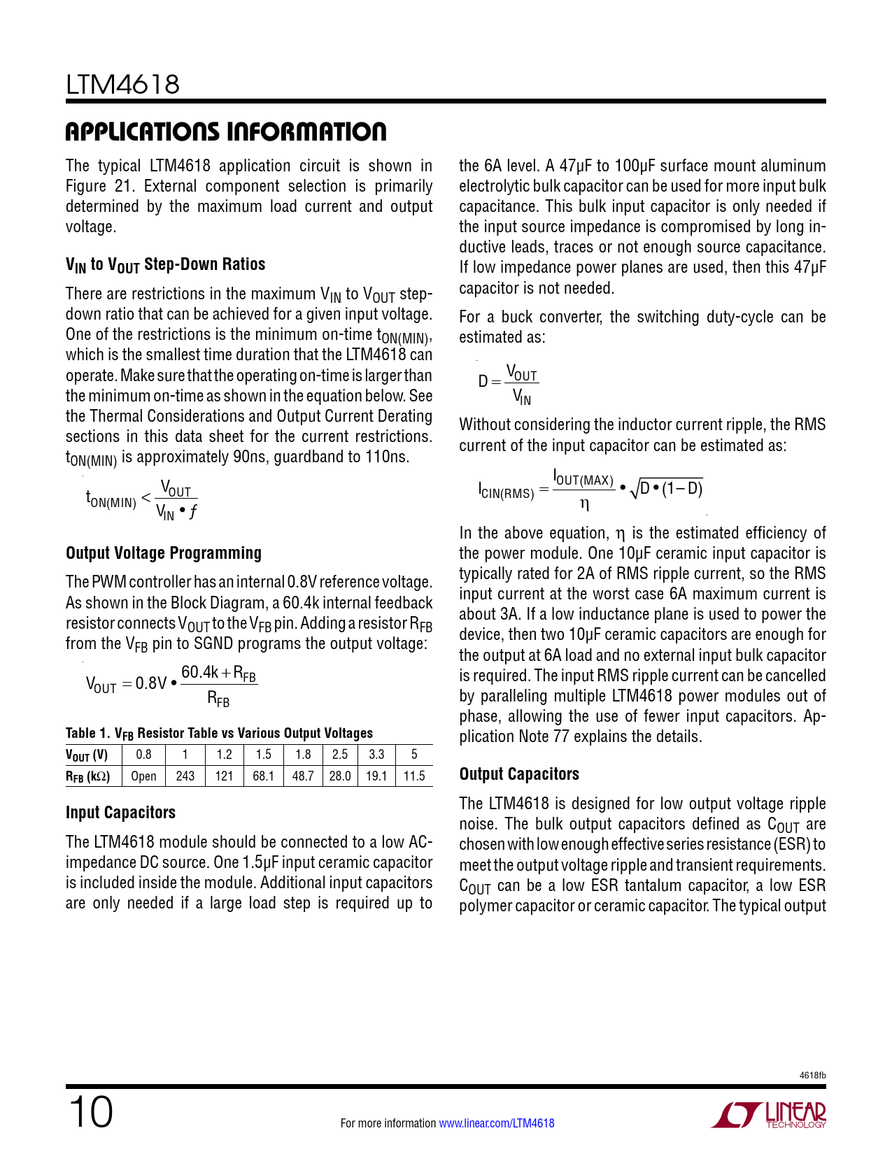 LTM4618 applicaTions inForMaTion The typical LTM4618 application circuit is shown in the 6A level. A 47µF to 100µF surface mount aluminum Figure 21. External component selection is primarily electrolytic bulk capacitor can be used for more input bulk determined by the maximum load current and output capacitance. This bulk input capacitor is only needed if voltage. the input source impedance is compromised by long in- ductive leads, traces or not enough source capacitance. VIN to VOUT Step-Down Ratios If low impedance power planes are used, then this 47µF There are restrictions in the maximum V capacitor is not needed. IN to VOUT step- down ratio that can be achieved for a given input voltage. For a buck converter, the switching duty-cycle can be One of the restrictions is the minimum on-time tON(MIN), estimated as: which is the smallest time duration that the LTM4618 can operate. Make sure that the operating on-time is larger than D = VOUT the minimum on-time as shown in the equation below. See VIN the Thermal Considerations and Output Current Derating Without considering the inductor current ripple, the RMS sections in this data sheet for the current restrictions. current of the input capacitor can be estimated as: tON(MIN) is approximately 90ns, guardband to 110ns. IOUT(MAX) t ICIN(RMS) = • D • (1– D) ON(MIN) < VOUT η VIN • ƒ In the above equation, η is the estimated efficiency of Output Voltage Programming the power module. One 10µF ceramic input capacitor is The PWM controller has an internal 0.8V reference voltage. typically rated for 2A of RMS ripple current, so the RMS As shown in the Block Diagram, a 60.4k internal feedback input current at the worst case 6A maximum current is resistor connects V about 3A. If a low inductance plane is used to power the OUT to the VFB pin. Adding a resistor RFB from the V device, then two 10µF ceramic capacitors are enough for FB pin to SGND programs the output voltage: the output at 6A load and no external input bulk capacitor V is required. The input RMS ripple current can be cancelled OUT = 0.8V • 60.4k + RFB RFB by paralleling multiple LTM4618 power modules out of phase, allowing the use of fewer input capacitors. Ap- Table 1. VFB Resistor Table vs Various Output Voltages plication Note 77 explains the details. VOUT (V) 0.8 1 1.2 1.5 1.8 2.5 3.3 5 RFB (k Ω ) Open 243 121 68.1 48.7 28.0 19.1 11.5 Output CapacitorsInput Capacitors The LTM4618 is designed for low output voltage ripple noise. The bulk output capacitors defined as COUT are The LTM4618 module should be connected to a low AC- chosen with low enough effective series resistance (ESR) to impedance DC source. One 1.5µF input ceramic capacitor meet the output voltage ripple and transient requirements. is included inside the module. Additional input capacitors COUT can be a low ESR tantalum capacitor, a low ESR are only needed if a large load step is required up to polymer capacitor or ceramic capacitor. The typical output 4618fb 10 For more information www.linear.com/LTM4618 Document Outline Features Description Applications Typical Application Absolute Maximum Ratings Pin Configuration Order Information Electrical Characteristics Typical Performance Characteristics Pin Functions Simplified Block Diagram Decoupling Requirements Operation Applications Information Typical Applications Package Photograph Package Description Revision History Typical Application Related Parts
