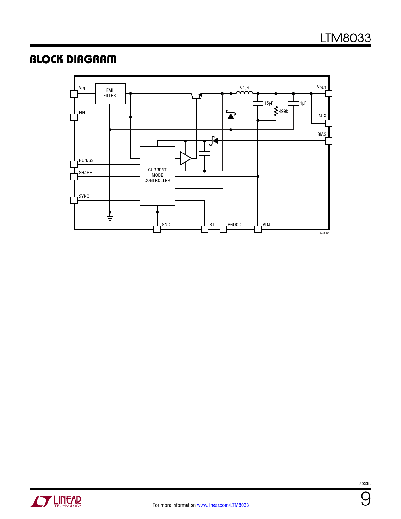 VIN V EMI 8.2µH OUT FILTER 15pF 1µF FIN 499k AUX BIAS RUN/SS CURRENT SHARE MODE CONTROLLER SYNC GND RT PGOOD ADJ 8033 BD 8033fb For more information www.linear.com/LTM8033 9 Document Outline Features Applications Description Typical Application Absolute Maximum Ratings Pin Configuration Order Information Electrical Characteristics Typical Performance Characteristics Pin Functions Block Diagram Operation Applications Information Typical Applications Package Description Package Photographs Revision History Typical Application Related Parts