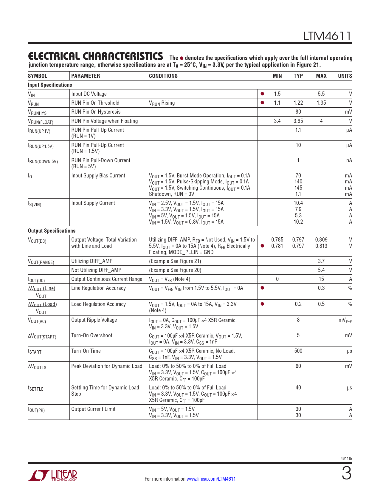 VIN Input DC Voltage l 1.5 5.5 V VRUN RUN Pin On Threshold VRUN Rising l 1.1 1.22 1.35 V VRUNHYS RUN Pin On Hysteresis 80 mV VRUN(FLOAT) RUN Pin Voltage when Floating 3.4 3.65 4 V IRUN(UP,1V) RUN Pin Pul -Up Current 1.1 µA (RUN = 1V) IRUN(UP,1.5V) RUN Pin Pul -Up Current 10 µA (RUN = 1.5V) IRUN(DOWN,5V) RUN Pin Pul -Down Current 1 nA (RUN = 5V) IQ Input Supply Bias Current VOUT = 1.5V, Burst Mode Operation, IOUT = 0.1A 70 mA VOUT = 1.5V, Pulse-Skipping Mode, IOUT = 0.1A 140 mA VOUT = 1.5V, Switching Continuous, IOUT = 0.1A 145 mA Shutdown, RUN = 0V 1.1 mA IS(VIN) Input Supply Current VIN = 2.5V, VOUT = 1.5V, IOUT = 15A 10.4 A VIN = 3.3V, VOUT = 1.5V, IOUT = 15A 7.9 A VIN = 5V, VOUT = 1.5V, IOUT = 15A 5.3 A VIN = 1.5V, VOUT = 0.8V, IOUT = 15A 10.2 A
