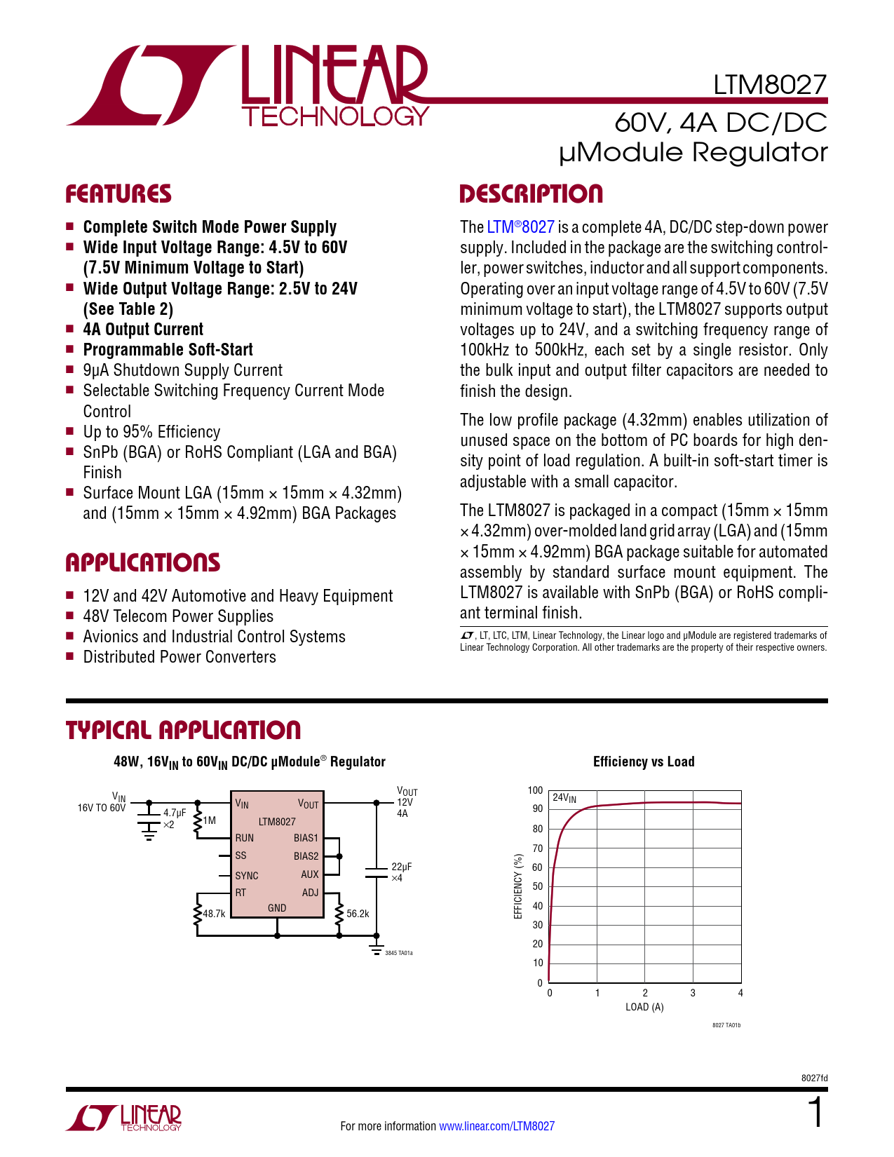 LTM8027 60V, 4A DC/DC µModule Regulator FEATURESDESCRIPTION n Complete Switch Mode Power Supply The LTM®8027 is a complete 4A, DC/DC step-down power n Wide Input Voltage Range: 4.5V to 60V supply. Included in the package are the switching control- (7.5V Minimum Voltage to Start) ler, power switches, inductor and all support components. n Wide Output Voltage Range: 2.5V to 24V Operating over an input voltage range of 4.5V to 60V (7.5V (See Table 2) minimum voltage to start), the LTM8027 supports output n 4A Output Current voltages up to 24V, and a switching frequency range of n Programmable Soft-Start 100kHz to 500kHz, each set by a single resistor. Only n 9µA Shutdown Supply Current the bulk input and output filter capacitors are needed to n Selectable Switching Frequency Current Mode finish the design. Control The low profile package (4.32mm) enables utilization of n Up to 95% Efficiency unused space on the bottom of PC boards for high den- n SnPb (BGA) or RoHS Compliant (LGA and BGA) sity point of load regulation. A built-in soft-start timer is Finish adjustable with a small capacitor. n Surface Mount LGA (15mm × 15mm × 4.32mm) and (15mm × 15mm × 4.92mm) BGA Packages The LTM8027 is packaged in a compact (15mm × 15mm × 4.32mm) over-molded land grid array (LGA) and (15mm APPLICATIONS × 15mm × 4.92mm) BGA package suitable for automated assembly by standard surface mount equipment. The n 12V and 42V Automotive and Heavy Equipment LTM8027 is available with SnPb (BGA) or RoHS compli- n 48V Telecom Power Supplies ant terminal finish. n L, LT, LTC, LTM, Linear Technology, the Linear logo and µModule are registered trademarks of Avionics and Industrial Control Systems Linear Technology Corporation. All other trademarks are the property of their respective owners. n Distributed Power Converters TYPICAL APPLICATION48W, 16VIN to 60VIN DC/DC µModule ® RegulatorEfficiency vs Load VOUT 100 VIN 24VIN VIN VOUT 16V TO 60V 12V 90 4.7µF 4A 1M LTM8027 ×2 80 RUN BIAS1 70 SS BIAS2 22µF 60 SYNC AUX ×4 50 RT ADJ GND 40 48.7k 56.2k EFFICIENCY (%) 30 20 3845 TA01a 10 0 0 1 2 3 4 LOAD (A) 8027 TA01b 8027fd For more information www.linear.com/LTM8027 1 Document Outline Features Applications Description Typical Application Absolute Maximum Ratings Pin Configuration Order Information Typical Performance Characteristics Pin Functions Block Diagram Operation Applications Information Typical Applications Package Photograph Package Description Revision History Typical Application Related Parts