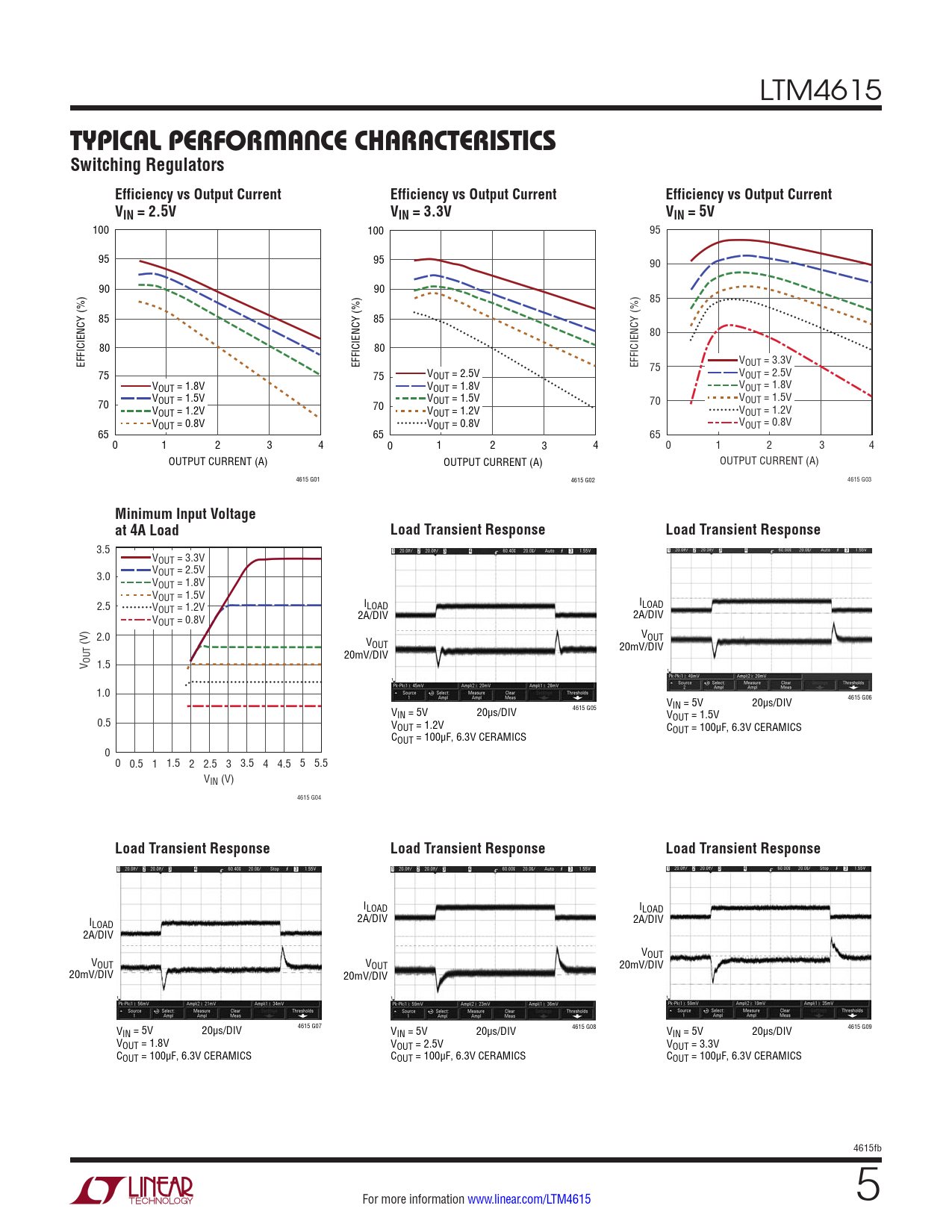 3.5 VOUT = 3.3V 3.0 VOUT = 2.5V VOUT = 1.8V VOUT = 1.5V I 2.5 V LOAD ILOAD OUT = 1.2V 2A/DIV 2A/DIV VOUT = 0.8V 2.0 V (V) V OUT OUT 20mV/DIV 20mV/DIV V OUT 1.5 1.0 VIN = 5V 20µs/DIV 4615 G06 VIN = 5V 20µs/DIV 4615 G05 VOUT = 1.5V 0.5 VOUT = 1.2V COUT = 100µF, 6.3V CERAMICS COUT = 100µF, 6.3V CERAMICS 0 0 0.5 1 1.5 2 2.5 3 3.5 4 4.5 5 5.5 VIN (V) 4615 G04