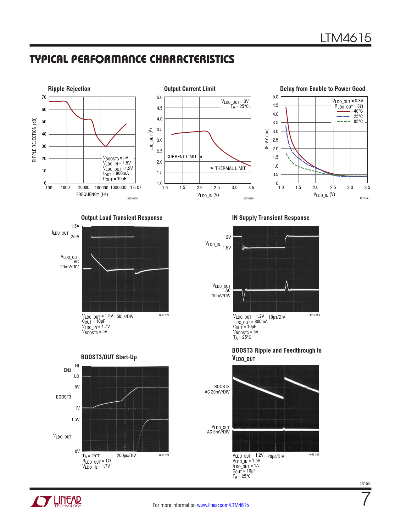 70 5.0 5.0 VLDO_OUT = 0V VLDO_OUT = 0.8V T 4.5 R 60 4.5 A = 25°C LDO_OUT = 8Ω –40°C 4.0 25°C 50 4.0 3.5 85°C 3.5 40 (A) 3.0 3.0 2.5 30 I LDO_OUT 2.5 DELAY (ms) 2.0 20 V CURRENT LIMIT 1.5 RIPPLE REJECTION (dB) BOOST3 = 5V VLDO_IN = 1.5V 2.0 1.0 10 VLDO_OUT =1.2V THERMAL LIMIT IOUT = 800mA 1.5 0.5 COUT = 10µF 0 1.0 0 100 1000 10000 100000 1000000 1E+07 1.0 1.5 2.0 2.5 3.0 3.5 1.0 1.5 2.0 2.5 3.0 3.5 FREQUENCY (Hz) VLDO_IN (V) VLDO_IN (V) 4615 G19 4615 G20 4615 G21