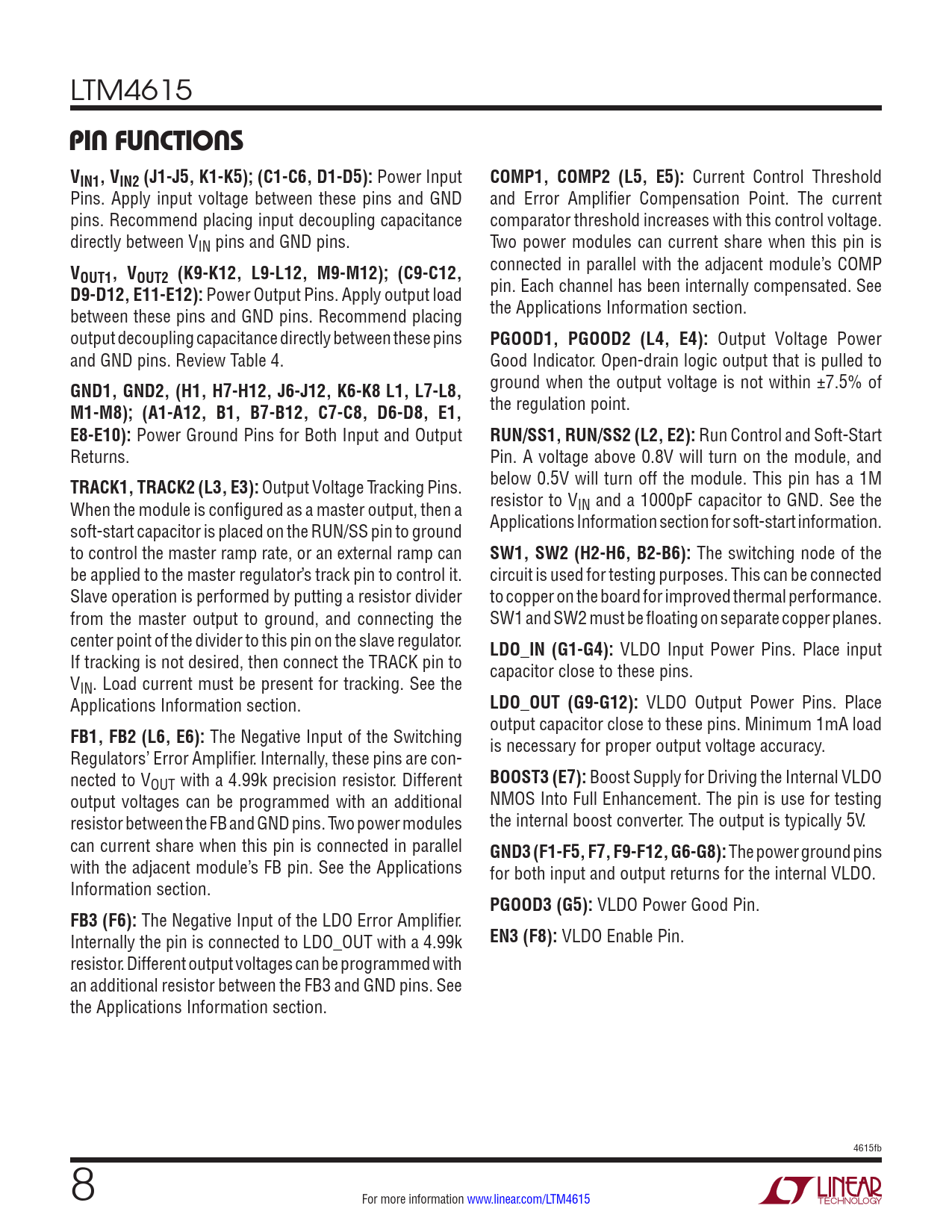 VLDO Enable Pin. resistor. Different output voltages can be programmed with an additional resistor between the FB3 and GND pins. See the Applications Information section. 4615fb 8 For more information www.linear.com/LTM4615 Document Outline Features Description Applications Typical Application Absolute Maximum Ratings Pin Configuration Order Information Electrical Characteristics Typical Performance Characteristics Pin Functions Simplified Block Diagram Decoupling Requirements Operation Applications Information Package Description Revision History Package Photograph Related Parts