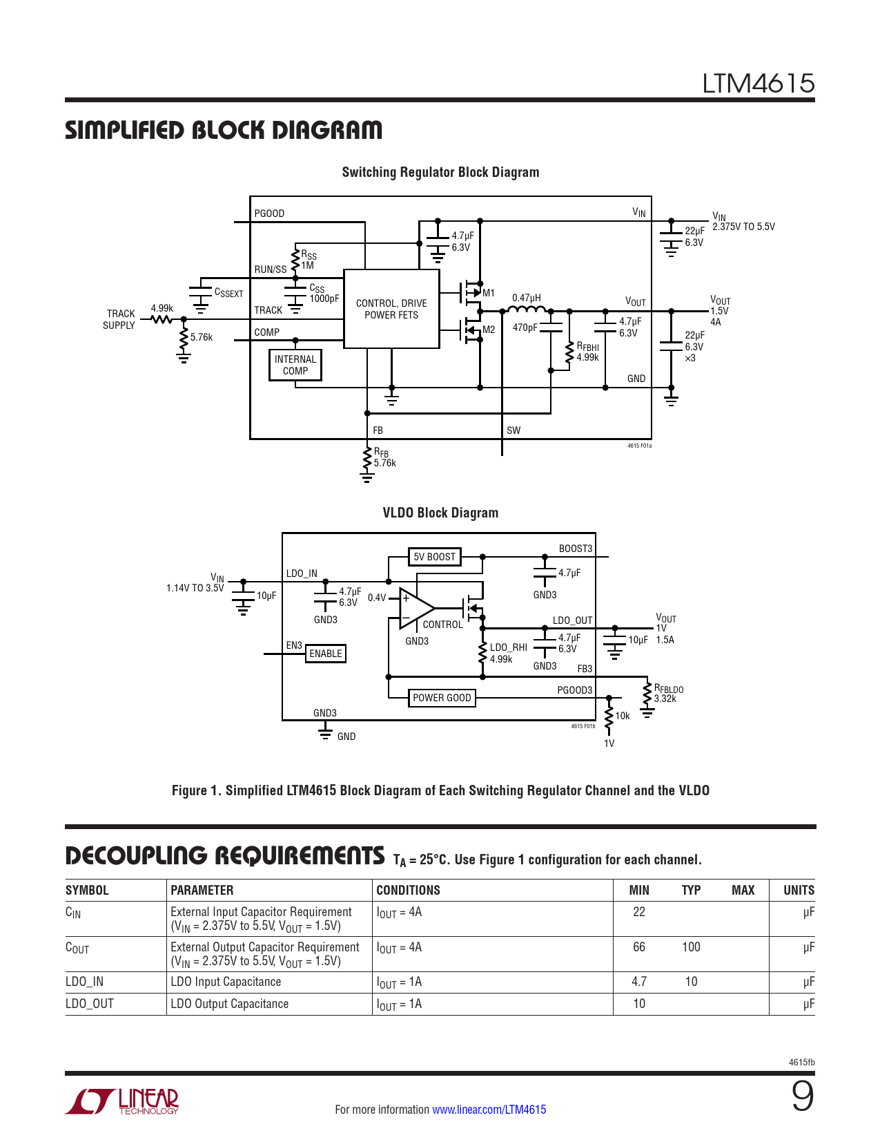 Figure 1. Simplified LTM4615 Block Diagram of Each Switching Regulator Channel and the VLDO Decoupling requireMenTs TA = 25°C. Use Figure 1 configuration for each channel. SYMBOL PARAMETER CONDITIONS MIN TYP MAX UNITS