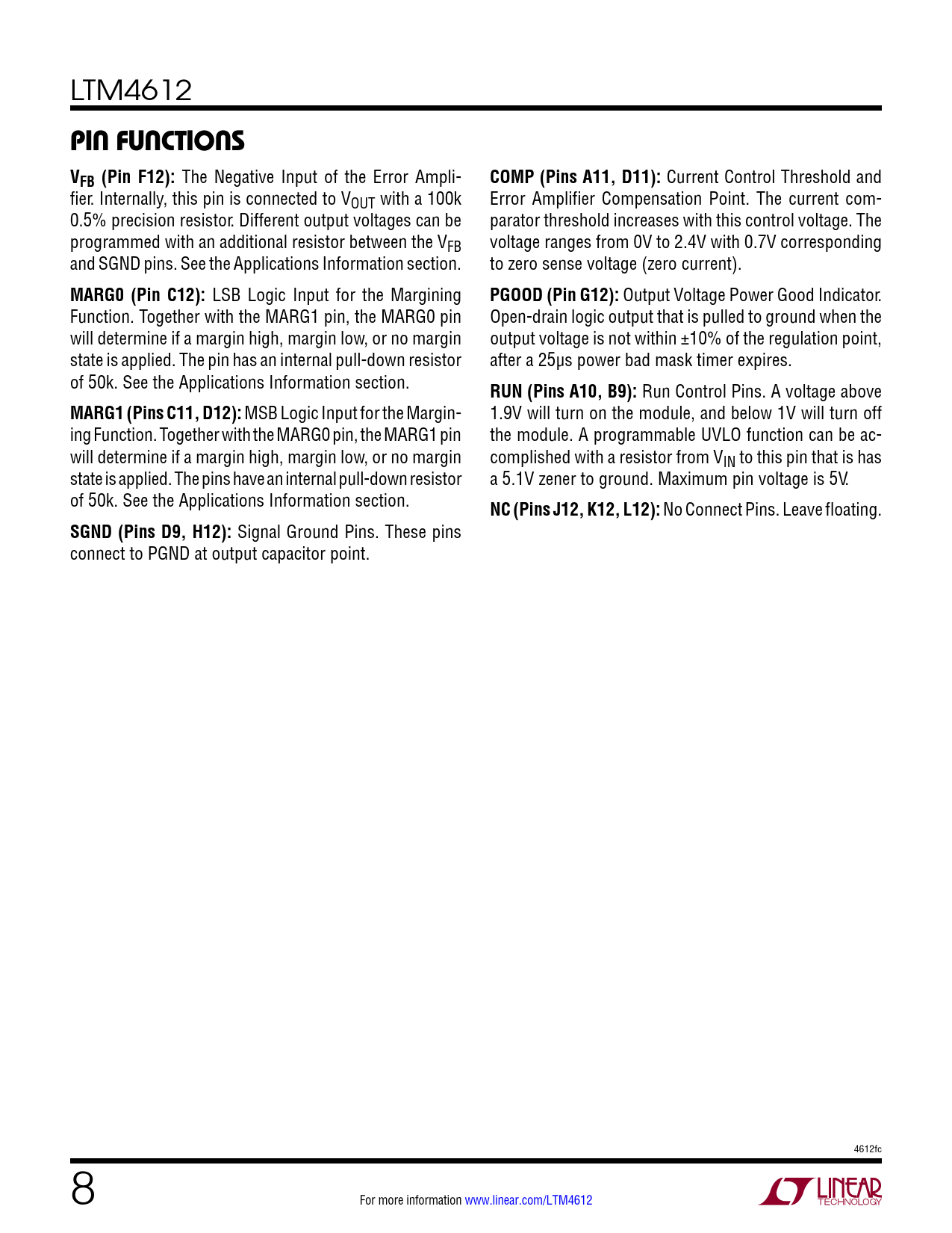 PIN FUNCTIONS VFB (Pin F12):. COMP (Pins A11, D11):. MARG0 (Pin C12):. PGOOD (Pin G12):. RUN (Pins A10, B9):