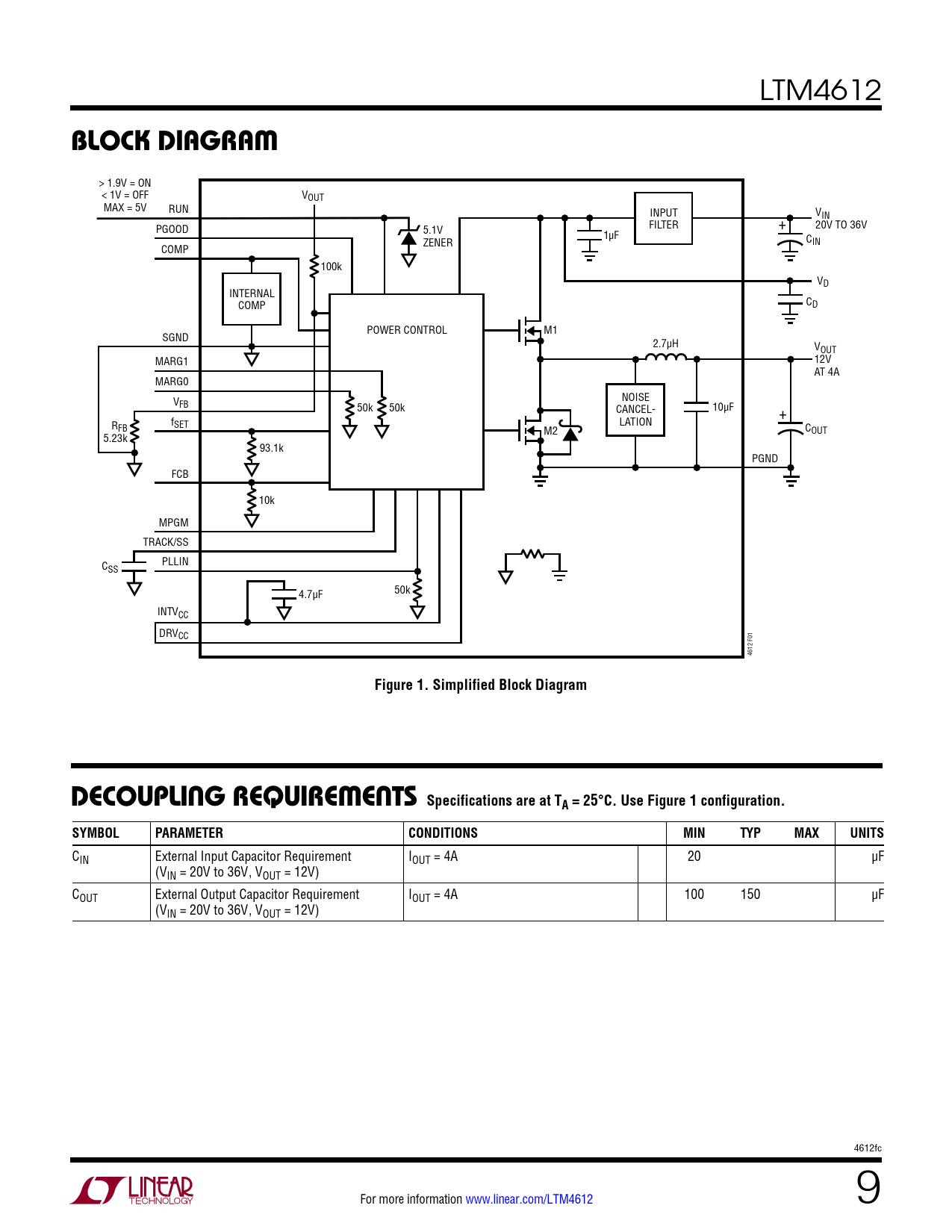CIN External Input Capacitor Requirement IOUT = 4A 20 µF (VIN = 20V to 36V, VOUT = 12V) COUT External Output Capacitor Requirement IOUT = 4A 100 150 µF (VIN = 20V to 36V, VOUT = 12V) 4612fc For more information www.linear.com/LTM4612 9 Document Outline Features Applications Description Typical Application Absolute Maximum Ratings Pin Configuration Order Information Electrical Characteristics Typical Performance Characteristics Pin Functions Block Diagram Decoupling Requirements Operation Applications Information Package Description Revision History Package Photograph Related Parts