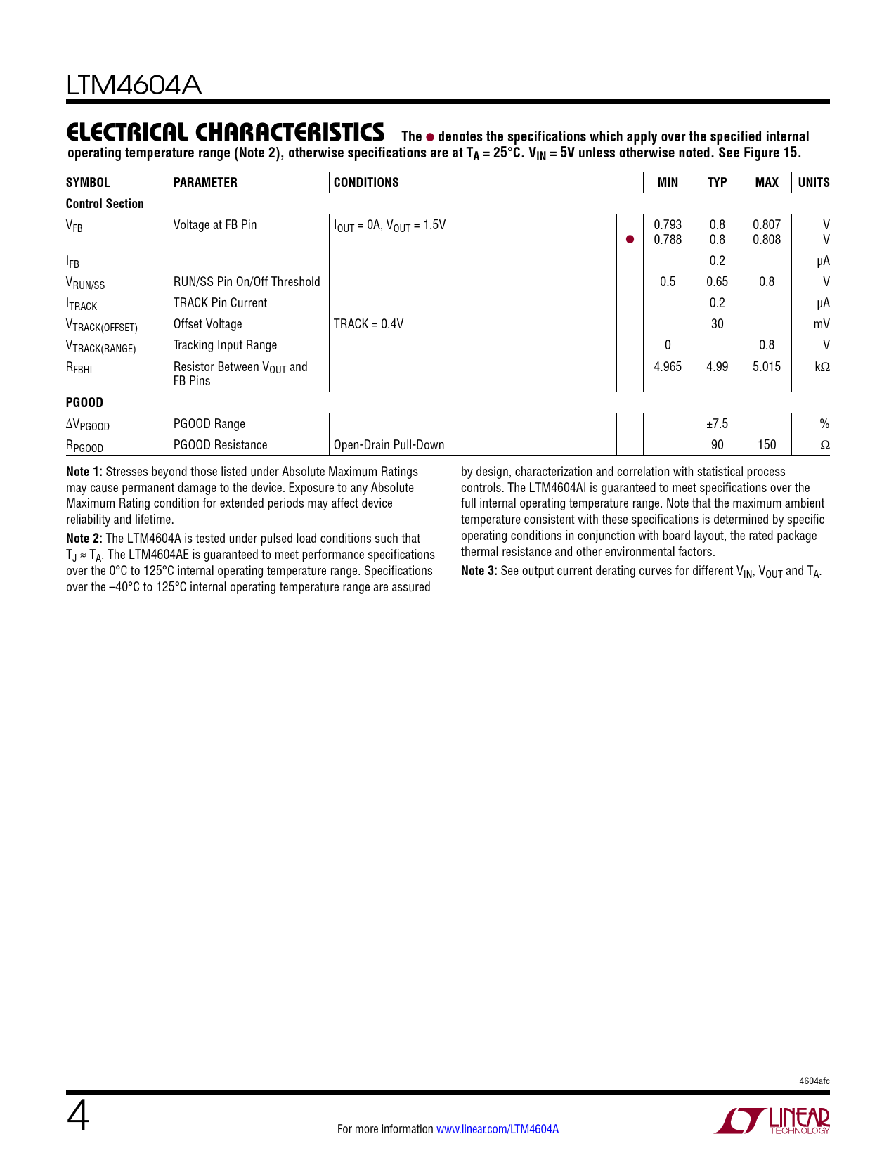 See output current derating curves for different VIN, VOUT and TA. over the –40°C to 125°C internal operating temperature range are assured 4604afc 4 For more information www.linear.com/LTM4604A Document Outline Features Applications Description Typical Application Absolute Maximum Ratings Pin Configuration Order Information Electrical Characteristics Typical Performance Characteristics Pin Functions Block Diagram Decoupling Requirements Operation Applications Information Typical Applications Package Description Revision History Package Photograph Related Parts