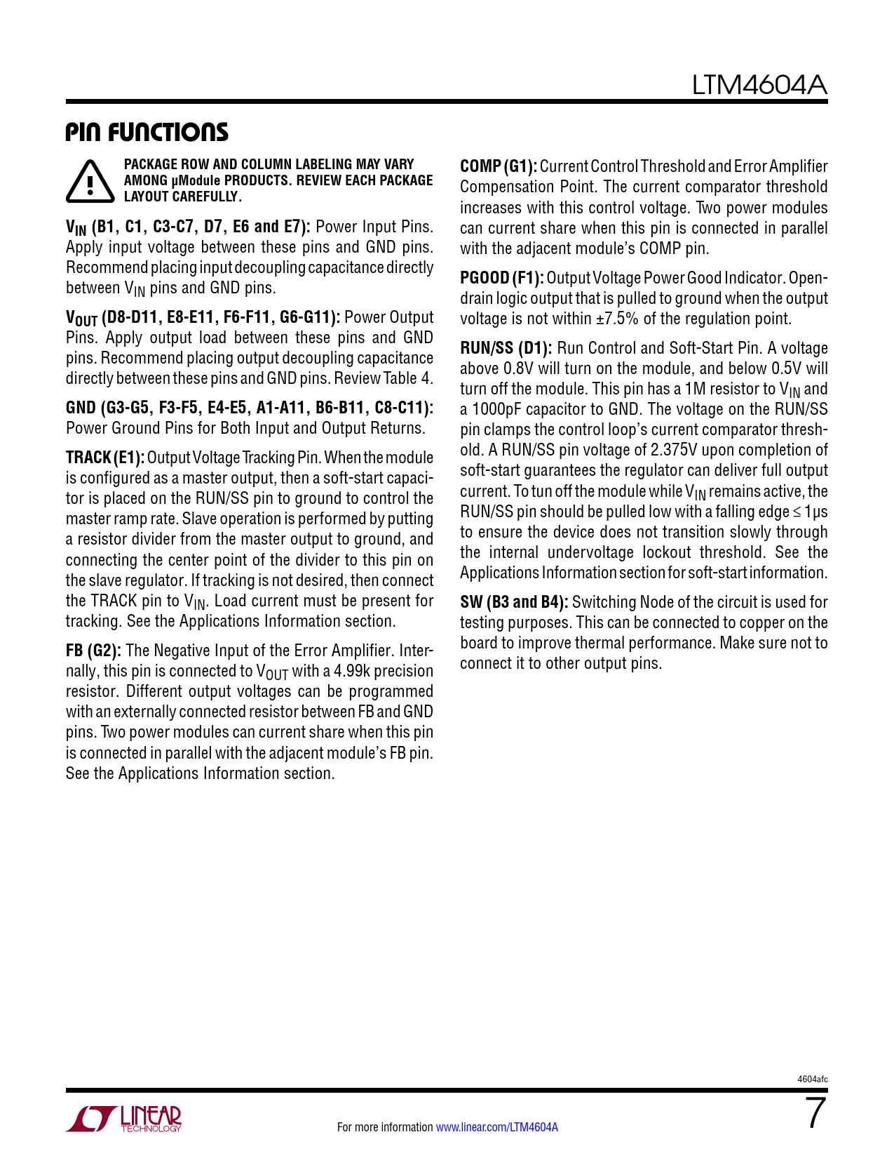 pin FuncTions. PACKAGE ROW AND COLUMN LABELING MAY VARY. COMP (G1):. AMONG µModule PRODUCTS. REVIEW EACH PACKAGE