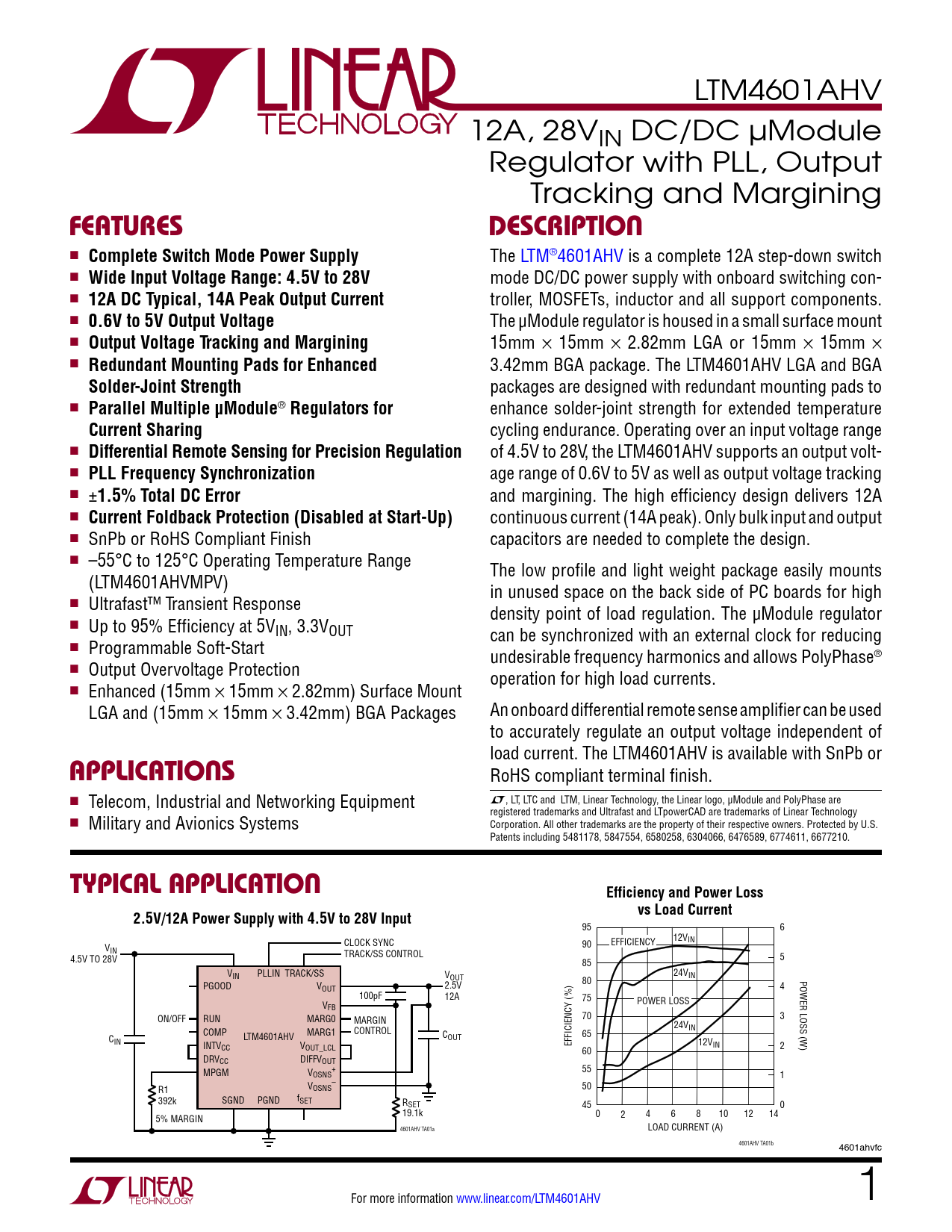 LTM4601AHV 12A, 28VIN DC/DC µModule Regulator with PLL, Output Tracking and Margining