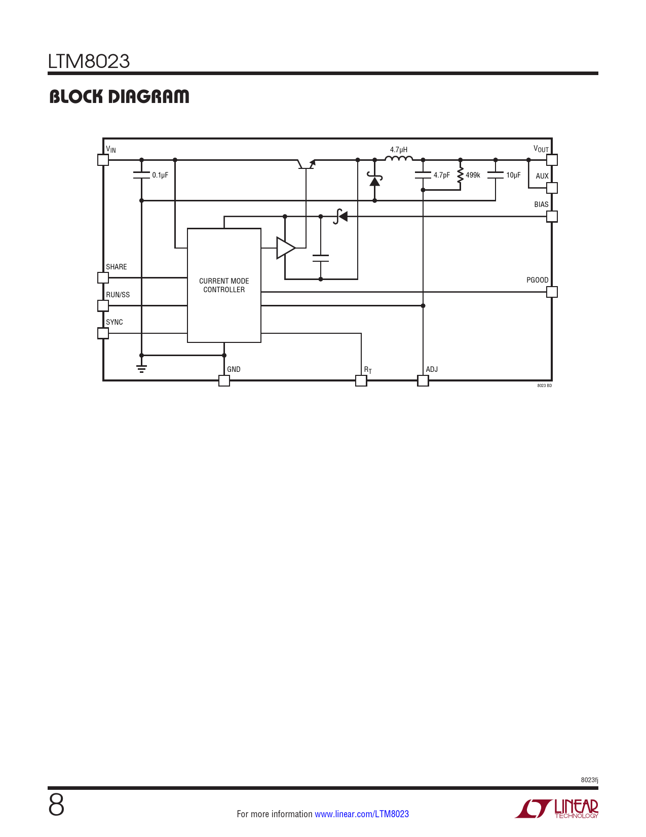 VIN 4.7µH VOUT 0.1µF 4.7pF 499k 10µF AUX BIAS SHARE CURRENT MODE PGOOD CONTROLLER RUN/SS SYNC GND RT ADJ 8023 BD 8023fj 8 For more information www.linear.com/LTM8023