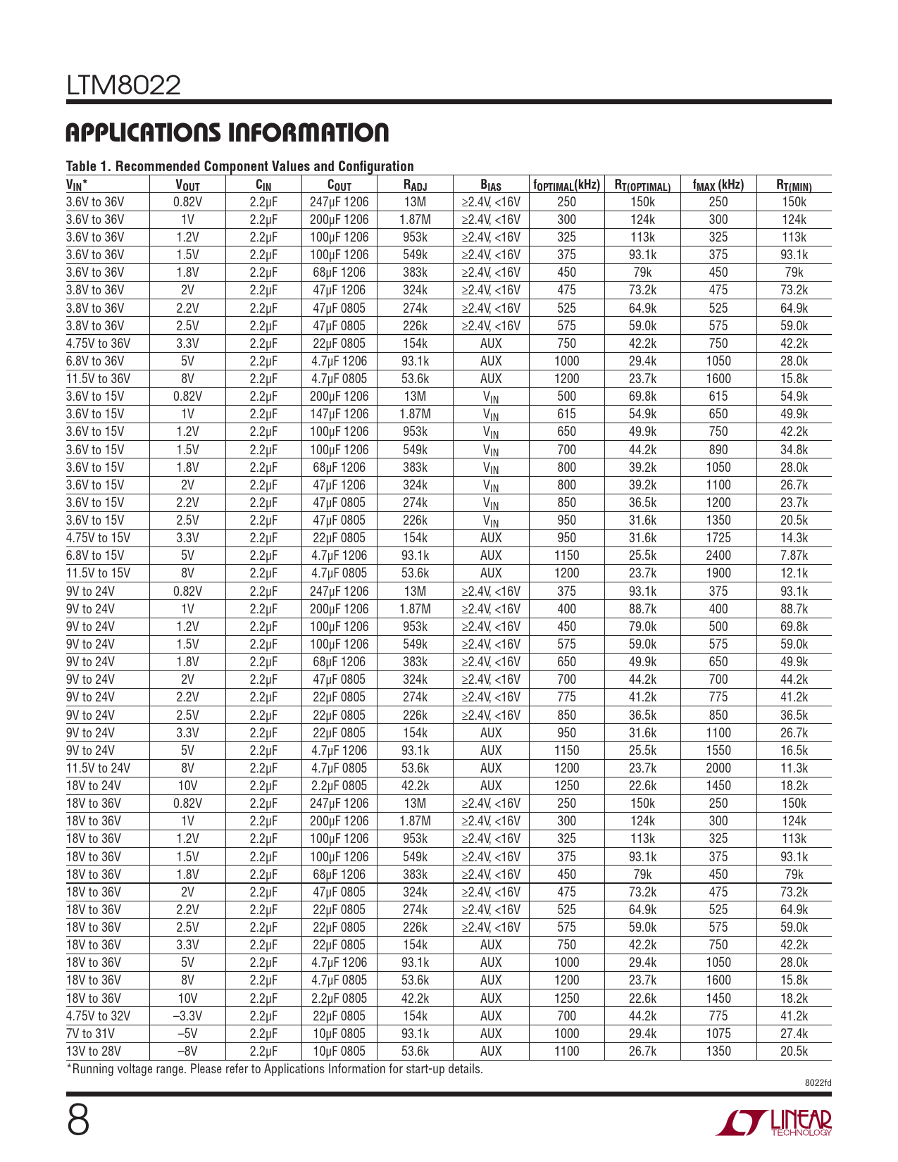 3.6V to 36V 0.82V 2.2μF 247μF 1206 13M ≥2.4V, <16V 250 150k 250 150k 3.6V to 36V 1V 2.2μF 200μF 1206 1.87M ≥2.4V, <16V 300 124k 300 124k 3.6V to 36V 1.2V 2.2μF 100μF 1206 953k ≥2.4V, <16V 325 113k 325 113k 3.6V to 36V 1.5V 2.2μF 100μF 1206 549k ≥2.4V, <16V 375 93.1k 375 93.1k 3.6V to 36V 1.8V 2.2μF 68μF 1206 383k ≥2.4V, <16V 450 79k 450 79k 3.8V to 36V 2V 2.2μF 47μF 1206 324k ≥2.4V, <16V 475 73.2k 475 73.2k 3.8V to 36V 2.2V 2.2μF 47μF 0805 274k ≥2.4V, <16V 525 64.9k 525 64.9k 3.8V to 36V 2.5V 2.2μF 47μF 0805 226k ≥2.4V, <16V 575 59.0k 575 59.0k 4.75V to 36V 3.3V 2.2μF 22μF 0805 154k AUX 750 42.2k 750 42.2k 6.8V to 36V 5V 2.2μF 4.7μF 1206 93.1k AUX 1000 29.4k 1050 28.0k 11.5V to 36V 8V 2.2μF 4.7μF 0805 53.6k AUX 1200 23.7k 1600 15.8k 3.6V to 15V 0.82V 2.2μF 200μF 1206 13M VIN 500 69.8k 615 54.9k 3.6V to 15V 1V 2.2μF 147μF 1206 1.87M VIN 615 54.9k 650 49.9k 3.6V to 15V 1.2V 2.2μF 100μF 1206 953k VIN 650 49.9k 750 42.2k 3.6V to 15V 1.5V 2.2μF 100μF 1206 549k VIN 700 44.2k 890 34.8k 3.6V to 15V 1.8V 2.2μF 68μF 1206 383k VIN 800 39.2k 1050 28.0k 3.6V to 15V 2V 2.2μF 47μF 1206 324k VIN 800 39.2k 1100 26.7k 3.6V to 15V 2.2V 2.2μF 47μF 0805 274k VIN 850 36.5k 1200 23.7k 3.6V to 15V 2.5V 2.2μF 47μF 0805 226k VIN 950 31.6k 1350 20.5k 4.75V to 15V 3.3V 2.2μF 22μF 0805 154k AUX 950 31.6k 1725 14.3k 6.8V to 15V 5V 2.2μF 4.7μF 1206 93.1k AUX 1150 25.5k 2400 7.87k 11.5V to 15V 8V 2.2μF 4.7μF 0805 53.6k AUX 1200 23.7k 1900 12.1k 9V to 24V 0.82V 2.2μF 247μF 1206 13M ≥2.4V, <16V 375 93.1k 375 93.1k 9V to 24V 1V 2.2μF 200μF 1206 1.87M ≥2.4V, <16V 400 88.7k 400 88.7k 9V to 24V 1.2V 2.2μF 100μF 1206 953k ≥2.4V, <16V 450 79.0k 500 69.8k 9V to 24V 1.5V 2.2μF 100μF 1206 549k ≥2.4V, <16V 575 59.0k 575 59.0k 9V to 24V 1.8V 2.2μF 68μF 1206 383k ≥2.4V, <16V 650 49.9k 650 49.9k 9V to 24V 2V 2.2μF 47μF 0805 324k ≥2.4V, <16V 700 44.2k 700 44.2k 9V to 24V 2.2V 2.2μF 22μF 0805 274k ≥2.4V, <16V 775 41.2k 775 41.2k 9V to 24V 2.5V 2.2μF 22μF 0805 226k ≥2.4V, <16V 850 36.5k 850 36.5k 9V to 24V 3.3V 2.2μF 22μF 0805 154k AUX 950 31.6k 1100 26.7k 9V to 24V 5V 2.2μF 4.7μF 1206 93.1k AUX 1150 25.5k 1550 16.5k 11.5V to 24V 8V 2.2μF 4.7μF 0805 53.6k AUX 1200 23.7k 2000 11.3k 18V to 24V 10V 2.2μF 2.2μF 0805 42.2k AUX 1250 22.6k 1450 18.2k 18V to 36V 0.82V 2.2μF 247μF 1206 13M ≥2.4V, <16V 250 150k 250 150k 18V to 36V 1V 2.2μF 200μF 1206 1.87M ≥2.4V, <16V 300 124k 300 124k 18V to 36V 1.2V 2.2μF 100μF 1206 953k ≥2.4V, <16V 325 113k 325 113k 18V to 36V 1.5V 2.2μF 100μF 1206 549k ≥2.4V, <16V 375 93.1k 375 93.1k 18V to 36V 1.8V 2.2μF 68μF 1206 383k ≥2.4V, <16V 450 79k 450 79k 18V to 36V 2V 2.2μF 47μF 0805 324k ≥2.4V, <16V 475 73.2k 475 73.2k 18V to 36V 2.2V 2.2μF 22μF 0805 274k ≥2.4V, <16V 525 64.9k 525 64.9k 18V to 36V 2.5V 2.2μF 22μF 0805 226k ≥2.4V, <16V 575 59.0k 575 59.0k 18V to 36V 3.3V 2.2μF 22μF 0805 154k AUX 750 42.2k 750 42.2k 18V to 36V 5V 2.2μF 4.7μF 1206 93.1k AUX 1000 29.4k 1050 28.0k 18V to 36V 8V 2.2μF 4.7μF 0805 53.6k AUX 1200 23.7k 1600 15.8k 18V to 36V 10V 2.2μF 2.2μF 0805 42.2k AUX 1250 22.6k 1450 18.2k 4.75V to 32V –3.3V 2.2μF 22μF 0805 154k AUX 700 44.2k 775 41.2k 7V to 31V –5V 2.2μF 10μF 0805 93.1k AUX 1000 29.4k 1075 27.4k 13V to 28V –8V 2.2μF 10μF 0805 53.6k AUX 1100 26.7k 1350 20.5k *Running voltage range. Please refer to Applications Information for start-up details. 8022fd 8