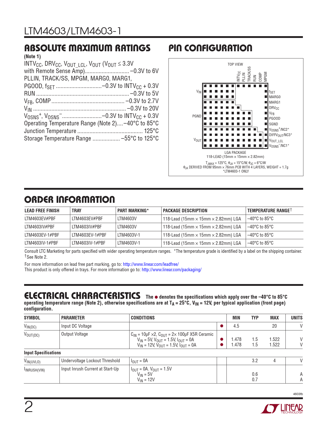 † LTM4603EV#PBF LTM4603EV#PBF LTM4603V 118-Lead (15mm × 15mm × 2.82mm) LGA –40°C to 85°C LTM4603IV#PBF LTM4603IV#PBF LTM4603V 118-Lead (15mm × 15mm × 2.82mm) LGA –40°C to 85°C LTM4603EV-1#PBF LTM4603EV-1#PBF LTM4603V-1 118-Lead (15mm × 15mm × 2.82mm) LGA –40°C to 85°C LTM4603IV-1#PBF LTM4603IV-1#PBF LTM4603V-1 118-Lead (15mm × 15mm × 2.82mm) LGA –40°C to 85°C Consult LTC Marketing for parts specified with wider operating temperature ranges. *The temperature grade is identified by a label on the shipping container. †See Note 2. For more information on lead free part marking, go to: http://www.linear.com/leadfree/ This product is only offered in trays. For more information go to: http://www.linear.com/packaging/