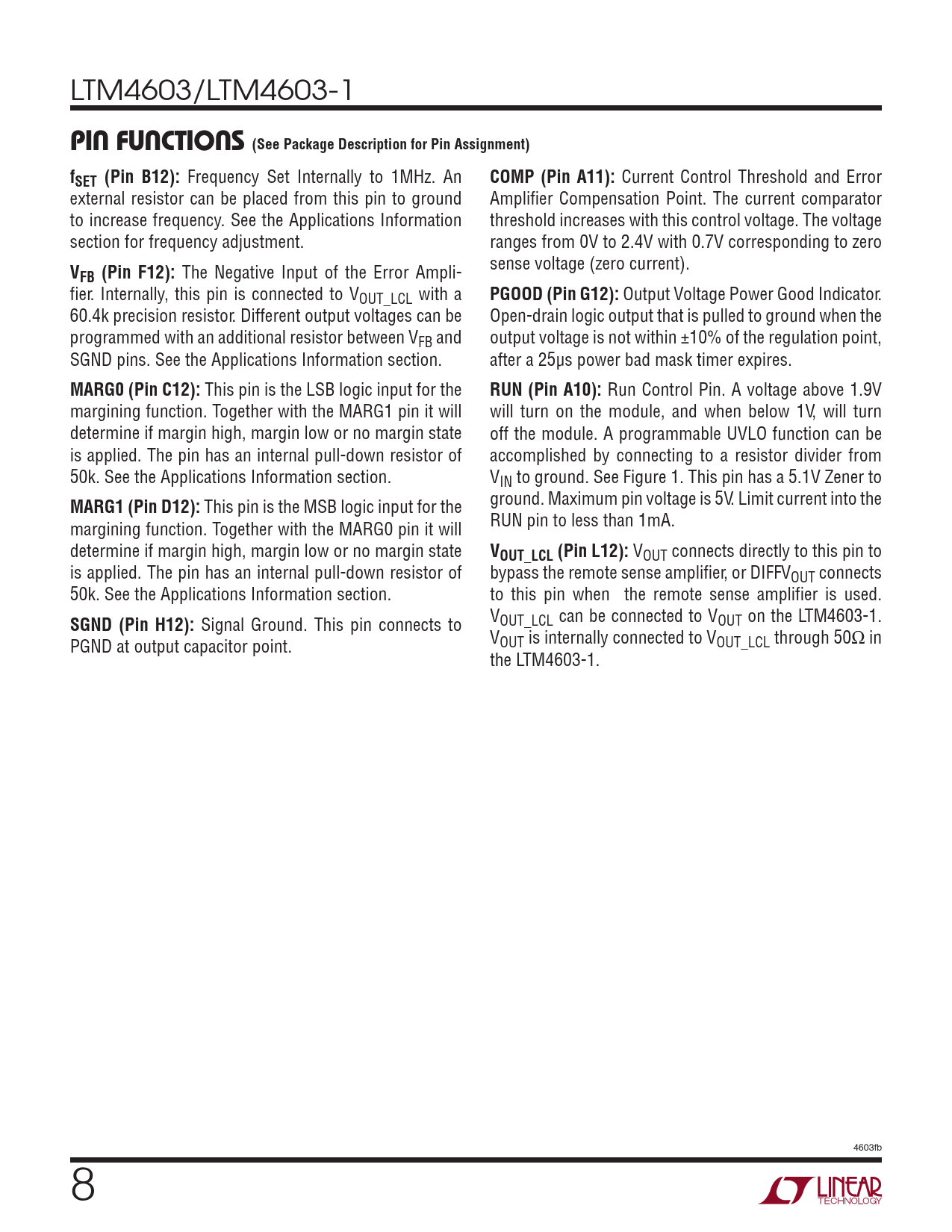 LTM4603/LTM4603-1 pin Functions (See Package Description for Pin Assignment) fSET (Pin B12): Frequency Set Internally to 1MHz. An COMP (Pin A11): Current Control Threshold and Error external resistor can be placed from this pin to ground Amplifier Compensation Point. The current comparator to increase frequency. See the Applications Information threshold increases with this control voltage. The voltage section for frequency adjustment. ranges from 0V to 2.4V with 0.7V corresponding to zero V sense voltage (zero current). FB (Pin F12): The Negative Input of the Error Ampli- fier. Internally, this pin is connected to VOUT_LCL with a PGOOD (Pin G12): Output Voltage Power Good Indicator. 60.4k precision resistor. Different output voltages can be Open-drain logic output that is pulled to ground when the programmed with an additional resistor between VFB and output voltage is not within ±10% of the regulation point, SGND pins. See the Applications Information section. after a 25µs power bad mask timer expires. MARG0 (Pin C12): This pin is the LSB logic input for the RUN (Pin A10): Run Control Pin. A voltage above 1.9V margining function. Together with the MARG1 pin it will will turn on the module, and when below 1V, will turn determine if margin high, margin low or no margin state off the module. A programmable UVLO function can be is applied. The pin has an internal pull-down resistor of accomplished by connecting to a resistor divider from 50k. See the Applications Information section. VIN to ground. See Figure 1. This pin has a 5.1V Zener to MARG1 (Pin D12): This pin is the MSB logic input for the ground. Maximum pin voltage is 5V. Limit current into the margining function. Together with the MARG0 pin it will RUN pin to less than 1mA. determine if margin high, margin low or no margin state VOUT_LCL (Pin L12): VOUT connects directly to this pin to is applied. The pin has an internal pull-down resistor of bypass the remote sense amplifier, or DIFFVOUT connects 50k. See the Applications Information section. to this pin when the remote sense amplifier is used. SGND (Pin H12): Signal Ground. This pin connects to VOUT_LCL can be connected to VOUT on the LTM4603-1. PGND at output capacitor point. VOUT is internally connected to VOUT_LCL through 50W in the LTM4603-1. 4603fb 8 Document Outline Features Applications Description Typical Application Absolute Maximum Ratings Pin Configuration Order Information Electrical Characteristics Typical Performance Characteristics Pin Functions Simplified Block Diagram Decoupling Requirements Operation Applications Information Typical Application Package Description Revision History Typical Application Package Photograph Related Parts