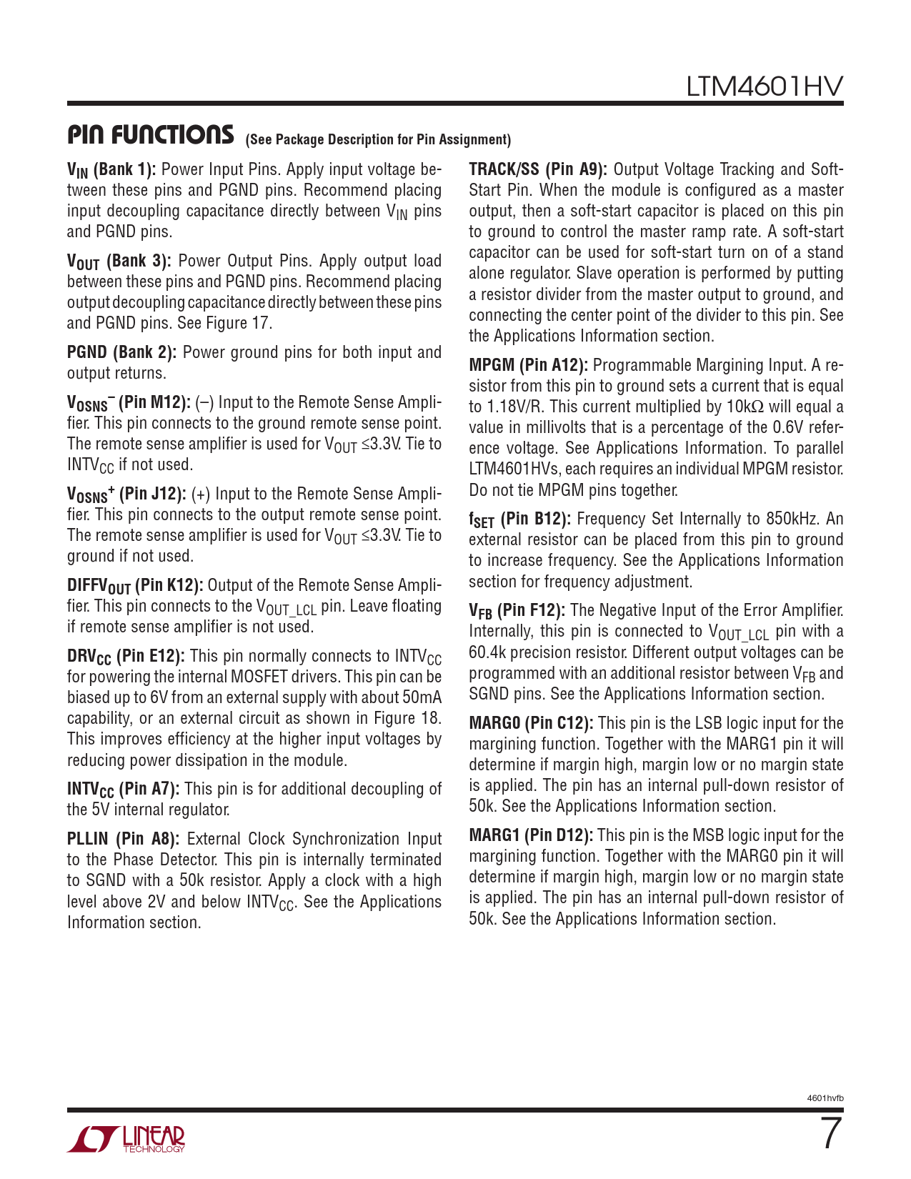 PIN FUNCTIONS (See Package Description for Pin Assignment) VIN (Bank 1):. TRACK/SS (Pin A9):. OUT (Bank 3):. PGND (Bank 2):