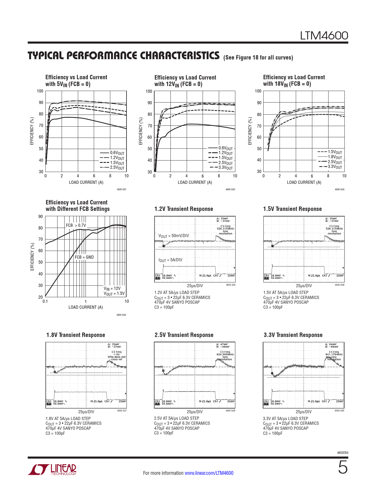 90 80 FCB > 0.7V V 70 OUT = 50mV/DIV 60 FCB = GND 50 IOUT = 5A/DIV EFFICIENCY (%) 40 30 V 25µs/DIV 4600 G05 25µs/DIV 4600 G06 IN = 12V VOUT = 1.5V 1.2V AT 5A/µs LOAD STEP 1.5V AT 5A/µs LOAD STEP 20 COUT = 3 • 22µF 6.3V CERAMICS COUT = 3 • 22µF 6.3V CERAMICS 0.1 1 10 470µF 4V SANYO POSCAP 470µF 4V SANYO POSCAP LOAD CURRENT (A) C3 = 100pF C3 = 100pF 4600 G04
