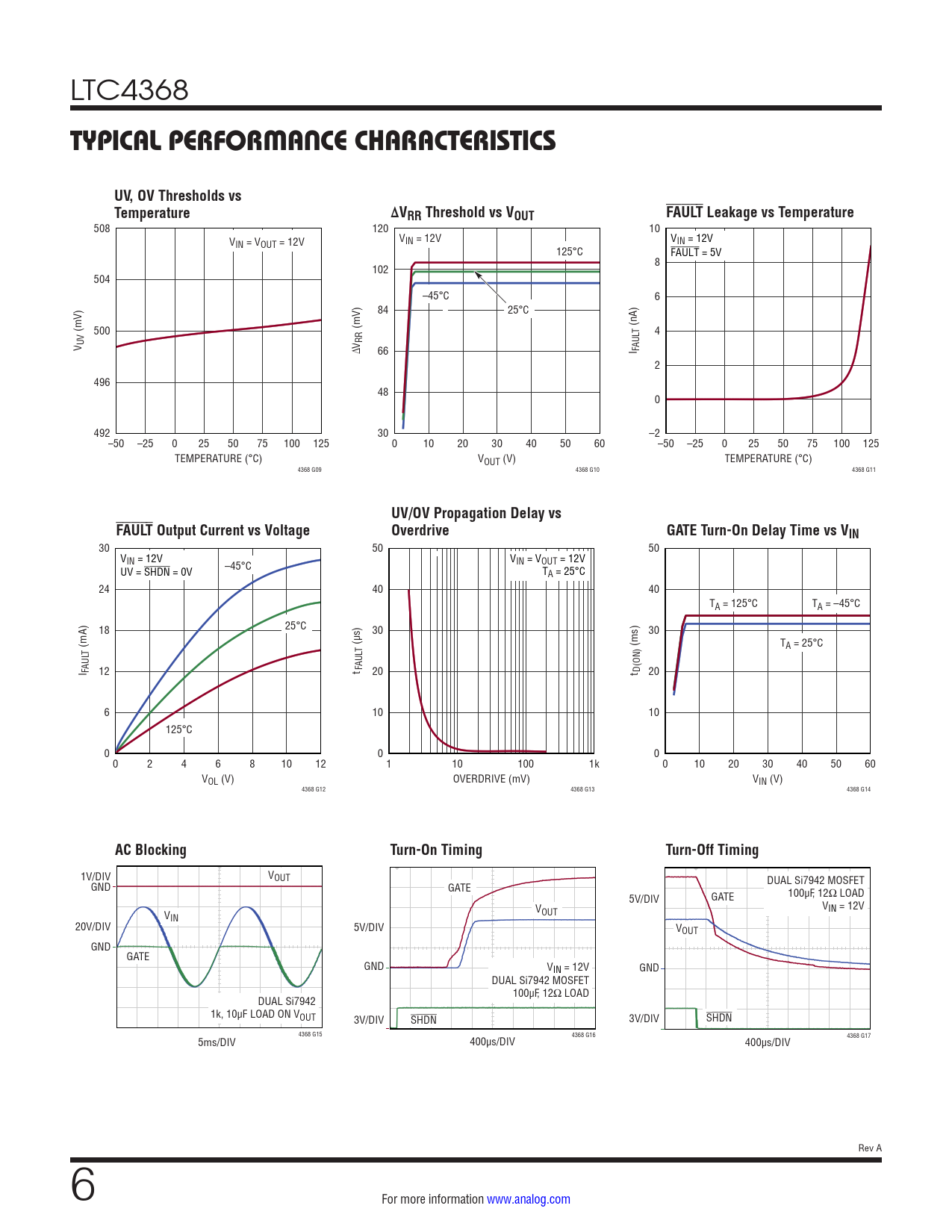 508 120 10 V V V IN = VOUT = 12V IN = 12V IN = 12V 125°C FAULT = 5V 8 102 504 –45°C 6 84 25°C (mV) 500 (mV) (nA) T 4 RR V UV ∆V 66 I FAUL 2 496 48 0 492 30 –2 –50 –25 0 25 50 75 100 125 0 10 20 30 40 50 60 –50 –25 0 25 50 75 100 125 TEMPERATURE (°C) VOUT (V) TEMPERATURE (°C) 4368 G09 4368 G10 4368 G11