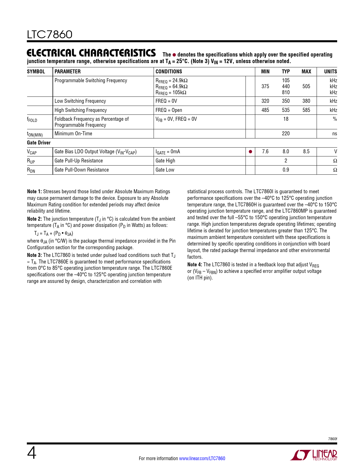 The LTC7860 is tested under pulsed load conditions such that TJ factors. ≈ TA. The LTC7860E is guaranteed to meet performance specifications