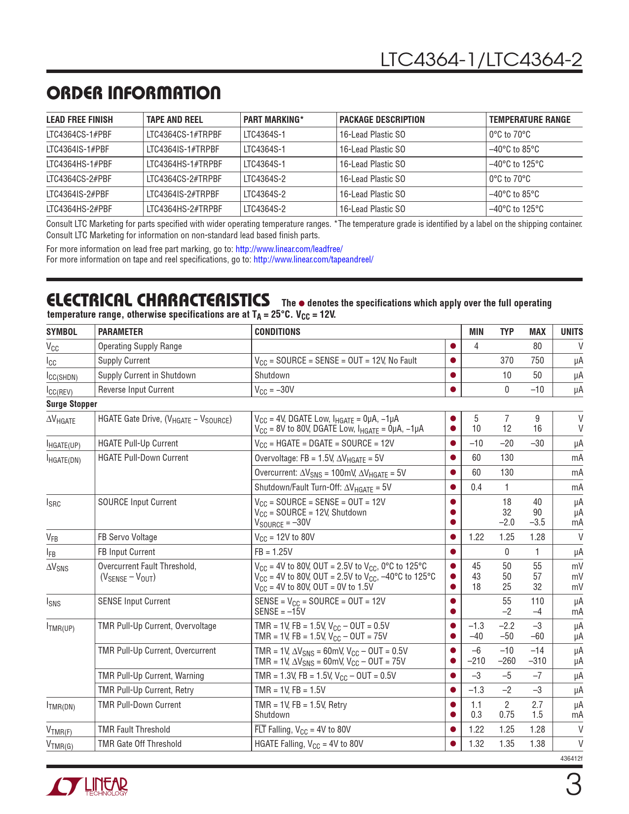 LTC4364CS-1#PBF LTC4364CS-1#TRPBF LTC4364S-1 16-Lead Plastic SO 0°C to 70°C LTC4364IS-1#PBF LTC4364IS-1#TRPBF LTC4364S-1 16-Lead Plastic SO –40°C to 85°C LTC4364HS-1#PBF LTC4364HS-1#TRPBF LTC4364S-1 16-Lead Plastic SO –40°C to 125°C LTC4364CS-2#PBF LTC4364CS-2#TRPBF LTC4364S-2 16-Lead Plastic SO 0°C to 70°C LTC4364IS-2#PBF LTC4364IS-2#TRPBF LTC4364S-2 16-Lead Plastic SO –40°C to 85°C LTC4364HS-2#PBF LTC4364HS-2#TRPBF LTC4364S-2 16-Lead Plastic SO –40°C to 125°C Consult LTC Marketing for parts specified with wider operating temperature ranges. *The temperature grade is identified by a label on the shipping container. Consult LTC Marketing for information on non-standard lead based finish parts. For more information on lead free part marking, go to: http://www.linear.com/leadfree/ For more information on tape and reel specifications, go to: http://www.linear.com/tapeandreel/