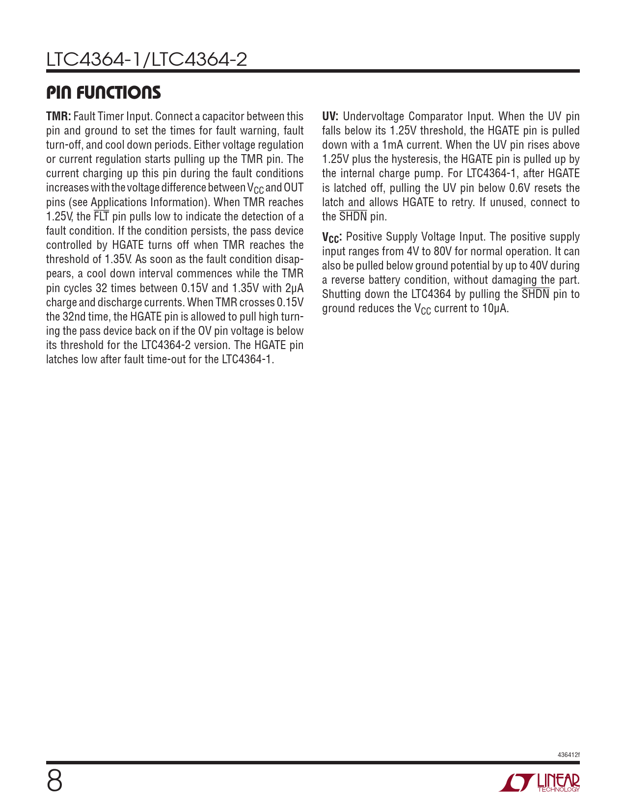LTC4364-1/LTC4364-2 PIN FUNCTIONS TMR: Fault Timer Input. Connect a capacitor between this UV: Undervoltage Comparator Input. When the UV pin pin and ground to set the times for fault warning, fault falls below its 1.25V threshold, the HGATE pin is pulled turn-off, and cool down periods. Either voltage regulation down with a 1mA current. When the UV pin rises above or current regulation starts pulling up the TMR pin. The 1.25V plus the hysteresis, the HGATE pin is pulled up by current charging up this pin during the fault conditions the internal charge pump. For LTC4364-1, after HGATE increases with the voltage difference between VCC and OUT is latched off, pulling the UV pin below 0.6V resets the pins (see Applications Information). When TMR reaches latch and allows HGATE to retry. If unused, connect to 1.25V, the FLT pin pulls low to indicate the detection of a the SHDN pin. fault condition. If the condition persists, the pass device V controlled by HGATE turns off when TMR reaches the CC: Positive Supply Voltage Input. The positive supply input ranges from 4V to 80V for normal operation. It can threshold of 1.35V. As soon as the fault condition disap- also be pulled below ground potential by up to 40V during pears, a cool down interval commences while the TMR a reverse battery condition, without damaging the part. pin cycles 32 times between 0.15V and 1.35V with 2μA Shutting down the LTC4364 by pulling the SHDN pin to charge and discharge currents. When TMR crosses 0.15V ground reduces the V the 32nd time, the HGATE pin is allowed to pull high turn- CC current to 10μA. ing the pass device back on if the OV pin voltage is below its threshold for the LTC4364-2 version. The HGATE pin latches low after fault time-out for the LTC4364-1. 436412f 8 Document Outline Features Applications Description Typical Application Absolute Maximum Ratings Pin Configuration Order Information Electrical Characteristics Typical Performance Characteristics Pin Functions Block Diagram Operation Applications Information Typical Applications Package Description Typical Application Related Parts