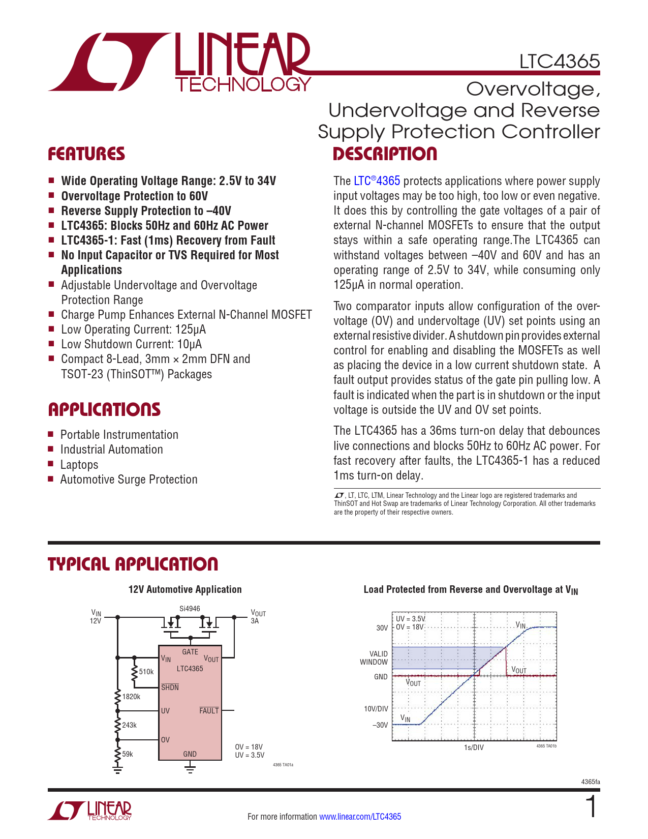 LTC4365 Overvoltage, Undervoltage and Reverse Supply Protection Controller FeaTuresDescripTion n Wide Operating Voltage Range: 2.5V to 34V The LTC®4365 protects applications where power supply n Overvoltage Protection to 60V input voltages may be too high, too low or even negative. n Reverse Supply Protection to –40V It does this by controlling the gate voltages of a pair of n LTC4365: Blocks 50Hz and 60Hz AC Power external N-channel MOSFETs to ensure that the output n LTC4365-1: Fast (1ms) Recovery from Fault stays within a safe operating range.The LTC4365 can n No Input Capacitor or TVS Required for Most withstand voltages between –40V and 60V and has an Applications operating range of 2.5V to 34V, while consuming only n Adjustable Undervoltage and Overvoltage 125µA in normal operation. Protection Range Two comparator inputs allow configuration of the over- n Charge Pump Enhances External N-Channel MOSFET voltage (OV) and undervoltage (UV) set points using an n Low Operating Current: 125µA external resistive divider. A shutdown pin provides external n Low Shutdown Current: 10µA control for enabling and disabling the MOSFETs as well n Compact 8-Lead, 3mm × 2mm DFN and as placing the device in a low current shutdown state. A TSOT-23 (ThinSOT™) Packages fault output provides status of the gate pin pulling low. A fault is indicated when the part is in shutdown or the input applicaTions voltage is outside the UV and OV set points. The LTC4365 has a 36ms turn-on delay that debounces n Portable Instrumentation live connections and blocks 50Hz to 60Hz AC power. For n Industrial Automation fast recovery after faults, the LTC4365-1 has a reduced n Laptops 1ms turn-on delay. n Automotive Surge Protection L, LT, LTC, LTM, Linear Technology and the Linear logo are registered trademarks and ThinSOT and Hot Swap are trademarks of Linear Technology Corporation. All other trademarks are the property of their respective owners. Typical applicaTion12V Automotive ApplicationLoad Protected from Reverse and Overvoltage at VIN V Si4946 IN VOUT UV = 3.5V 12V 3A 30V OV = 18V VIN GATE VALID VIN VOUT WINDOW LTC4365 V 510k OUT GND VOUT SHDN 1820k 10V/DIV UV FAULT VIN 243k –30V OV 4365 TA01b OV = 18V 1s/DIV 59k GND UV = 3.5V 4365 TA01a 4365fa For more information www.linear.com/LTC4365 1 Document Outline Features Applications Description Typical Application Absolute Maximum Ratings Pin Configuration Order Information Electrical Characteristics Typical Performance Characteristics Pin Functions Block Diagram Operation Applications Information Package Description Revision History Related Parts