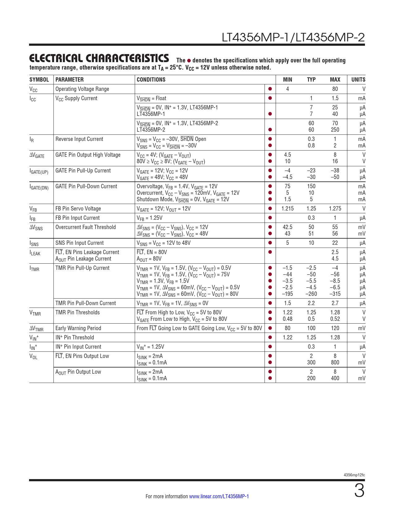 VCC Operating Voltage Range l 4 80 V ICC VCC Supply Current VSHDN = Float l 1 1.5 mA VSHDN = 0V, IN+ = 1.3V, LT4356MP-1 7 25 µA LT4356MP-1 l 7 40 µA VSHDN = 0V, IN+ = 1.3V, LT4356MP-2 60 70 µA LT4356MP-2 l 60 250 µA IR Reverse Input Current VSNS = VCC = –30V, SHDN Open l 0.3 1 mA VSNS = VCC = VSHDN = –30V l 0.8 2 mA ΔVGATE GATE Pin Output High Voltage VCC = 4V; (VGATE – VOUT) l 4.5 8 V 80V ≥ VCC ≥ 8V; (VGATE – VOUT) l 10 16 V IGATE(UP) GATE Pin Pull-Up Current VGATE = 12V; VCC = 12V l –4 –23 –38 µA VGATE = 48V; VCC = 48V l –4.5 –30 –50 µA IGATE(DN) GATE Pin Pull-Down Current Overvoltage, VFB = 1.4V, VGATE = 12V l 75 150 mA Overcurrent, VCC – VSNS = 120mV, VGATE = 12V l 5 10 mA Shutdown Mode, VSHDN = 0V, VGATE = 12V l 1.5 5 mA VFB FB Pin Servo Voltage VGATE = 12V; VOUT = 12V l 1.215 1.25 1.275 V IFB FB Pin Input Current VFB = 1.25V l 0.3 1 µA ΔVSNS Overcurrent Fault Threshold ΔVSNS = (VCC – VSNS), VCC = 12V l 42.5 50 55 mV ΔVSNS = (VCC – VSNS), VCC = 48V l 43 51 56 mV ISNS SNS Pin Input Current VSNS = VCC = 12V to 48V l 5 10 22 µA ILEAK FLT, EN Pins Leakage Current FLT, EN = 80V l 2.5 µA AOUT Pin Leakage Current AOUT = 80V 4.5 µA ITMR TMR Pin Pull-Up Current VTMR = 1V, VFB = 1.5V, (VCC – VOUT) = 0.5V l –1.5 –2.5 –4 µA VTMR = 1V, VFB = 1.5V, (VCC – VOUT) = 75V l –44 –50 –56 µA VTMR = 1.3V, VFB = 1.5V l –3.5 –5.5 –8.5 µA VTMR = 1V, ΔVSNS = 60mV, (VCC – VOUT) = 0.5V l –2.5 –4.5 –6.5 µA VTMR = 1V, ΔVSNS = 60mV, (VCC – VOUT) = 80V l –195 –260 –315 µA TMR Pin Pull-Down Current VTMR = 1V, VFB = 1V, ΔVSNS = 0V l 1.5 2.2 2.7 µA VTMR TMR Pin Thresholds FLT From High to Low, VCC = 5V to 80V l 1.22 1.25 1.28 V VGATE From Low to High, VCC = 5V to 80V l 0.48 0.5 0.52 V ΔVTMR Early Warning Period From FLT Going Low to GATE Going Low, VCC = 5V to 80V l 80 100 120 mV V + IN IN+ Pin Threshold l 1.22 1.25 1.28 V I + + IN IN+ Pin Input Current VIN = 1.25V l 0.3 1 µA VOL FLT, EN Pins Output Low ISINK = 2mA l 2 8 V ISINK = 0.1mA l 300 800 mV AOUT Pin Output Low ISINK = 2mA l 2 8 V ISINK = 0.1mA l 200 400 mV 4356mp12fc For more information www.linear.com/LT4356MP-1 3