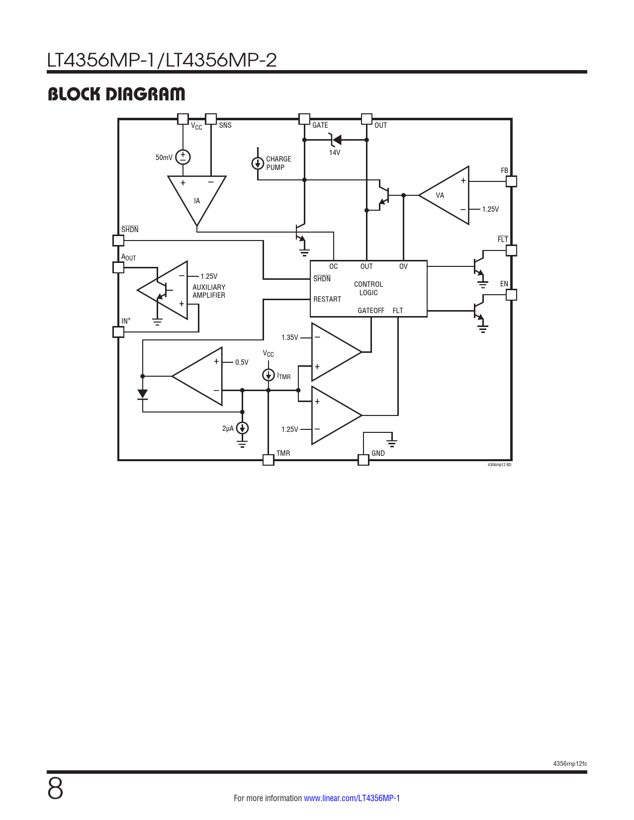 VCC SNS GATE OUT + 14V 50mV – CHARGE PUMP FB + + – VA IA – 1.25V SHDN FLT AOUT – OC OUT OV 1.25V SHDN AUXILIARY CONTROL EN + AMPLIFIER LOGIC RESTART GATEOFF FLT IN+ 1.35V – VCC + 0.5V + ITMR – + 2µA 1.25V – TMR GND 4356mp12 BD 4356mp12fc 8 For more information www.linear.com/LT4356MP-1