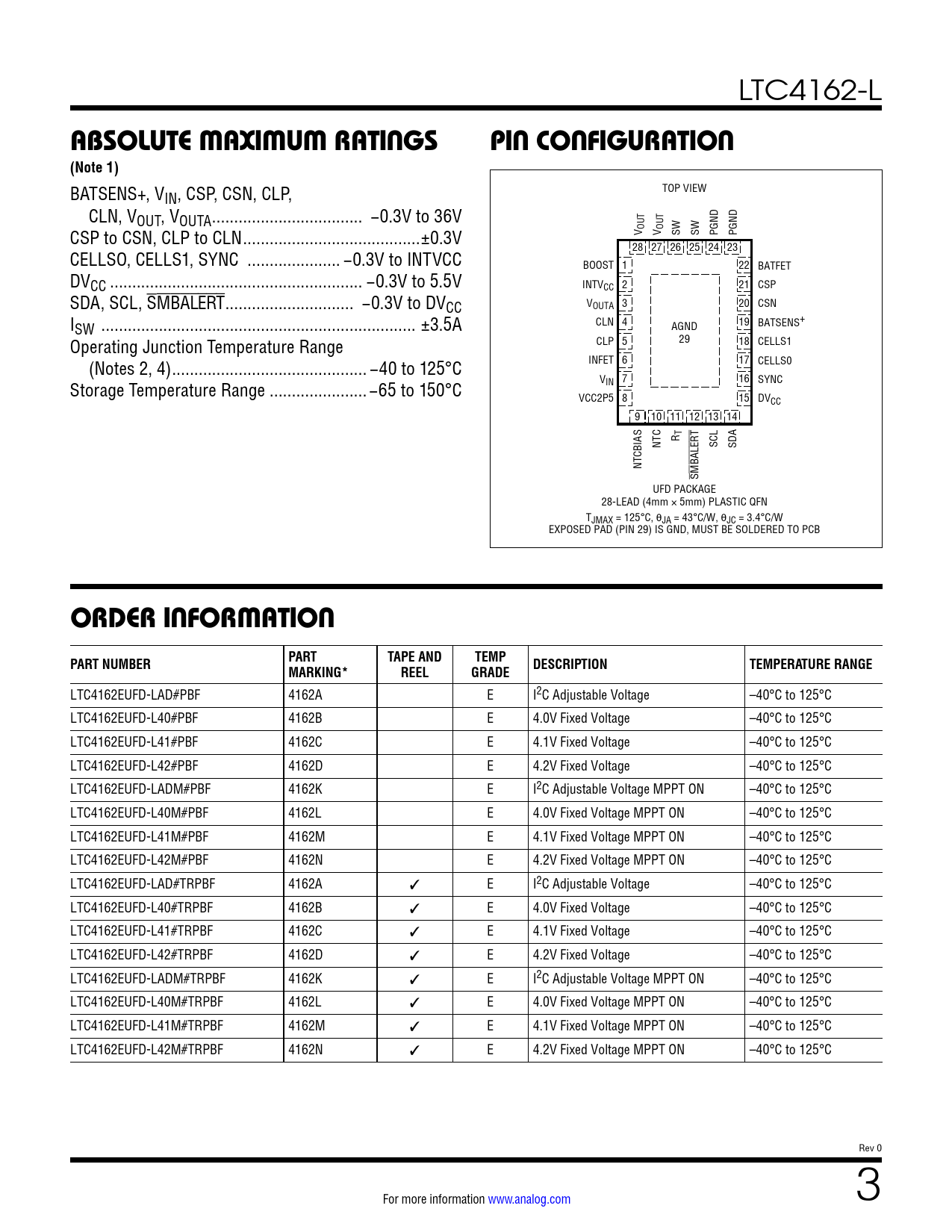 LTC4162EUFD-LAD#PBF 4162A E I2C Adjustable Voltage –40°C to 125°C LTC4162EUFD-L40#PBF 4162B E 4.0V Fixed Voltage –40°C to 125°C LTC4162EUFD-L41#PBF 4162C E 4.1V Fixed Voltage –40°C to 125°C LTC4162EUFD-L42#PBF 4162D E 4.2V Fixed Voltage –40°C to 125°C LTC4162EUFD-LADM#PBF 4162K E I2C Adjustable Voltage MPPT ON –40°C to 125°C LTC4162EUFD-L40M#PBF 4162L E 4.0V Fixed Voltage MPPT ON –40°C to 125°C LTC4162EUFD-L41M#PBF 4162M E 4.1V Fixed Voltage MPPT ON –40°C to 125°C LTC4162EUFD-L42M#PBF 4162N E 4.2V Fixed Voltage MPPT ON –40°C to 125°C LTC4162EUFD-LAD#TRPBF 4162A ✓ E I2C Adjustable Voltage –40°C to 125°C LTC4162EUFD-L40#TRPBF 4162B ✓ E 4.0V Fixed Voltage –40°C to 125°C LTC4162EUFD-L41#TRPBF 4162C ✓ E 4.1V Fixed Voltage –40°C to 125°C LTC4162EUFD-L42#TRPBF 4162D ✓ E 4.2V Fixed Voltage –40°C to 125°C LTC4162EUFD-LADM#TRPBF 4162K ✓ E I2C Adjustable Voltage MPPT ON –40°C to 125°C LTC4162EUFD-L40M#TRPBF 4162L ✓ E 4.0V Fixed Voltage MPPT ON –40°C to 125°C LTC4162EUFD-L41M#TRPBF 4162M ✓ E 4.1V Fixed Voltage MPPT ON –40°C to 125°C LTC4162EUFD-L42M#TRPBF 4162N ✓ E 4.2V Fixed Voltage MPPT ON –40°C to 125°C Rev 0 For more information www.analog.com 3 Document Outline Features Applications Typical Application Description Absolute Maximum Ratings Order Information Pin Configuration Electrical Characteristics Typical Performance Characteristics Pin Functions Block Diagram ESD Diagram Timing Diagram Operation Applications Information Register Descriptions Typical Applications Package Description Typical Application Related Parts