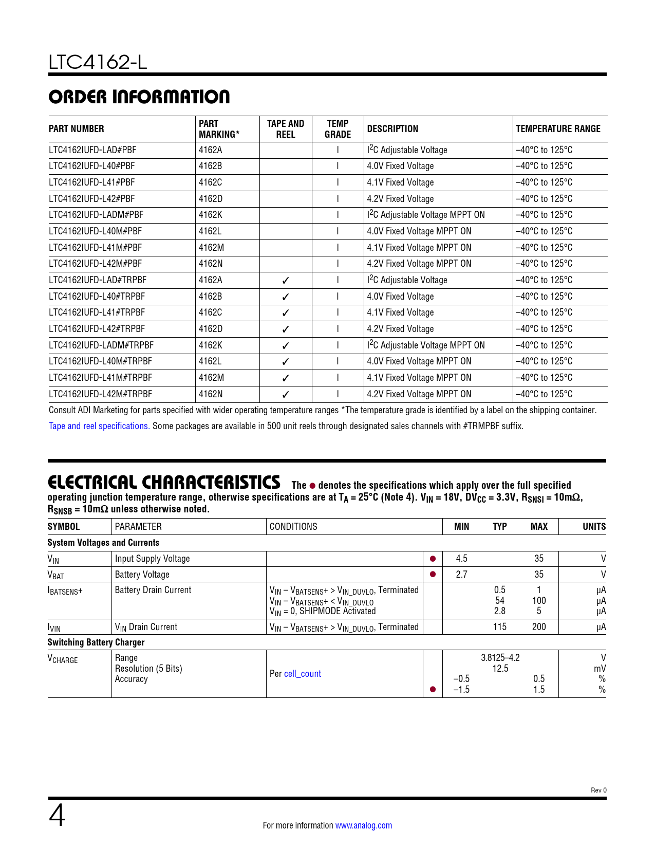 link to page 46 LTC4162-L ORDER INFORMATIONPART NUMBERPARTTAPE ANDTEMPMARKING*REELGRADEDESCRIPTIONTEMPERATURE RANGE LTC4162IUFD-LAD#PBF 4162A I I2C Adjustable Voltage –40°C to 125°C LTC4162IUFD-L40#PBF 4162B I 4.0V Fixed Voltage –40°C to 125°C LTC4162IUFD-L41#PBF 4162C I 4.1V Fixed Voltage –40°C to 125°C LTC4162IUFD-L42#PBF 4162D I 4.2V Fixed Voltage –40°C to 125°C LTC4162IUFD-LADM#PBF 4162K I I2C Adjustable Voltage MPPT ON –40°C to 125°C LTC4162IUFD-L40M#PBF 4162L I 4.0V Fixed Voltage MPPT ON –40°C to 125°C LTC4162IUFD-L41M#PBF 4162M I 4.1V Fixed Voltage MPPT ON –40°C to 125°C LTC4162IUFD-L42M#PBF 4162N I 4.2V Fixed Voltage MPPT ON –40°C to 125°C LTC4162IUFD-LAD#TRPBF 4162A ✓ I I2C Adjustable Voltage –40°C to 125°C LTC4162IUFD-L40#TRPBF 4162B ✓ I 4.0V Fixed Voltage –40°C to 125°C LTC4162IUFD-L41#TRPBF 4162C ✓ I 4.1V Fixed Voltage –40°C to 125°C LTC4162IUFD-L42#TRPBF 4162D ✓ I 4.2V Fixed Voltage –40°C to 125°C LTC4162IUFD-LADM#TRPBF 4162K ✓ I I2C Adjustable Voltage MPPT ON –40°C to 125°C LTC4162IUFD-L40M#TRPBF 4162L ✓ I 4.0V Fixed Voltage MPPT ON –40°C to 125°C LTC4162IUFD-L41M#TRPBF 4162M ✓ I 4.1V Fixed Voltage MPPT ON –40°C to 125°C LTC4162IUFD-L42M#TRPBF 4162N ✓ I 4.2V Fixed Voltage MPPT ON –40°C to 125°C Consult ADI Marketing for parts specified with wider operating temperature ranges *The temperature grade is identified by a label on the shipping container. Tape and reel specifications. Some packages are available in 500 unit reels through designated sales channels with #TRMPBF suffix. ELECTRICAL CHARACTERISTICSThe l denotes the specifications which apply over the full specifiedoperating junction temperature range, otherwise specifications are at TA = 25°C (Note 4). VIN = 18V, DVCC = 3.3V, RSNSI = 10mΩ,RSNSB = 10mΩ unless otherwise noted. SYMBOL PARAMETER CONDITIONS MINTYPMAXUNITSSystem Voltages and Currents VIN Input Supply Voltage l 4.5 35 V VBAT Battery Voltage l 2.7 35 V IBATSENS+ Battery Drain Current VIN – VBATSENS+ > VIN_DUVLO, Terminated 0.5 1 µA VIN – VBATSENS+ < VIN_DUVLO 54 100 µA VIN = 0, SHIPMODE Activated 2.8 5 µA IVIN VIN Drain Current VIN – VBATSENS+ > VIN_DUVLO, Terminated 115 200 µA Switching Battery Charger VCHARGE Range 3.8125–4.2 V Resolution (5 Bits) 12.5 mV Accuracy Per cell_count –0.5 0.5 % l –1.5 1.5 % Rev 0 4 For more information www.analog.com Document Outline Features Applications Typical Application Description Absolute Maximum Ratings Order Information Pin Configuration Electrical Characteristics Typical Performance Characteristics Pin Functions Block Diagram ESD Diagram Timing Diagram Operation Applications Information Register Descriptions Typical Applications Package Description Typical Application Related Parts