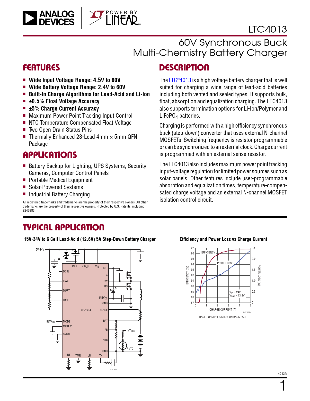 LTC4013 60V Synchronous Buck Multi-Chemistry Battery Charger FEATURESDESCRIPTION n Wide Input Voltage Range: 4.5V to 60V The LTC®4013 is a high voltage battery charger that is well n Wide Battery Voltage Range: 2.4V to 60V suited for charging a wide range of lead-acid batteries n Built-In Charge Algorithms for Lead-Acid and Li-Ion including both vented and sealed types. It supports bulk, n ±0.5% Float Voltage Accuracy float, absorption and equalization charging. The LTC4013 n ±5% Charge Current Accuracy also supports termination options for Li-Ion/Polymer and n Maximum Power Point Tracking Input Control LiFePO4 batteries. n NTC Temperature Compensated Float Voltage Charging is performed with a high efficiency synchronous n Two Open Drain Status Pins buck (step-down) converter that uses external N-channel n Thermally Enhanced 28-Lead 4mm × 5mm QFN MOSFETs. Switching frequency is resistor programmable Package or can be synchronized to an external clock. Charge current is programmed with an external sense resistor. APPLICATIONS n The LTC4013 also includes maximum power point tracking Battery Backup for Lighting, UPS Systems, Security input-voltage regulation for limited power sources such as Cameras, Computer Control Panels n solar panels. Other features include user-programmable Portable Medical Equipment n absorption and equalization times, temperature-compen- Solar-Powered Systems n sated charge voltage and an external N-channel MOSFET Industrial Battery Charging isolation control circuit. All registered trademarks and trademarks are the property of their respective owners. All other trademarks are the property of their respective owners. Protected by U.S. Patents, including 9246383. TYPICAL APPLICATION15V-34V to 6 Cell Lead-Acid (12.6V) 5A Step-Down Battery ChargerEfficiency and Power Loss vs Charge Current 15V-34V 97 2.5 EFFICIENCY 96 95 2.0 POWER LOSS POWER LOSS (W) INFET VIN_S V 94 IN BST DCIN 93 1.5 TG 92 ENAB SW 91 1.0 EFFICIENCY (%) BG 90 MPPT 89 VIN = 24V 0.5 V INTV BAT = 13.8V CC 88 FBOC PGND 87 0 0 1 2 3 4 5 LTC4013 SENSE CHARGE CURRENT (A) 4013 TA01a BASED ON APPLICATION ON BACK PAGE INTVCC MODE1 BAT MODE2 FB INTVCC SYNC NTC RNTC SGND RT TMR LB ITH 4013 TA01 4013fa 1