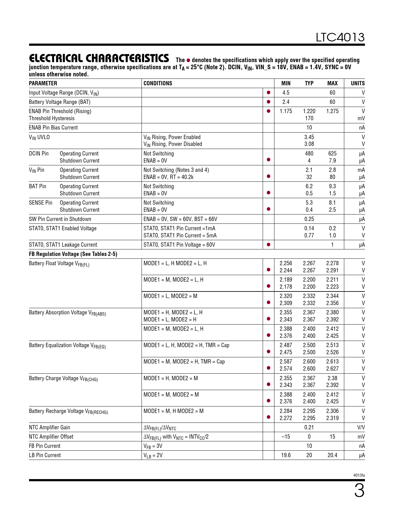 Battery Float Voltage VFB(FL) MODE1 = L, H MODE2 = L, H 2.256 2.267 2.278 V l 2.244 2.267 2.291 V MODE1 = M, MODE2 = L, H 2.189 2.200 2.211 V l 2.178 2.200 2.223 V MODE1 = L, MODE2 = M 2.320 2.332 2.344 V l 2.309 2.332 2.356 V Battery Absorption Voltage VFB(ABS) MODE1 = H, MODE2 = L, H 2.355 2.367 2.380 V MODE1 = L, MODE2 = H l 2.343 2.367 2.392 V MODE1 = M, MODE2 = L, H 2.388 2.400 2.412 V l 2.376 2.400 2.425 V Battery Equalization Voltage VFB(EQ) MODE1 = L, H, MODE2 = H, TMR = Cap 2.487 2.500 2.513 V l 2.475 2.500 2.526 V MODE1 = M, MODE2 = H, TMR = Cap 2.587 2.600 2.613 V l 2.574 2.600 2.627 V Battery Charge Voltage VFB(CHG) MODE1 = H, MODE2 = M 2.355 2.367 2.38 V l 2.343 2.367 2.392 V MODE1 = M, MODE2 = M 2.388 2.400 2.412 V l 2.376 2.400 2.425 V Battery Recharge Voltage VFB(RECHG) MODE1 = M, H MODE2 = M 2.284 2.295 2.306 V l 2.272 2.295 2.319 V NTC Amplifier Gain ∆VFB(FL)/∆VNTC 0.21 V/V NTC Amplifier Offset ∆VFB(FL) with VNTC = INTVCC/2 –15 0 15 mV FB Pin Current VFB = 3V 10 nA LB Pin Current VLB = 2V 19.6 20 20.4 μA 4013fa 3