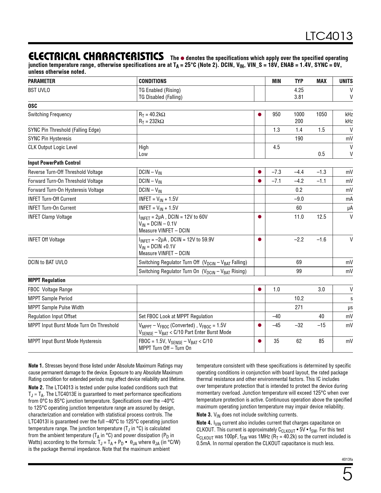 LTC4013 ELECTRICAL CHARACTERISTICSThe l denotes the specifications which apply over the specified operatingjunction temperature range, otherwise specifications are at TA = 25°C (Note 2). DCIN, VIN, VIN_S = 18V, ENAB = 1.4V, SYNC = 0V,unless otherwise noted.PARAMETERCONDITIONSMINTYPMAXUNITS BST UVLO TG Enabled (Rising) 4.25 V TG Disabled (Falling) 3.81 V OSC Switching Frequency RT = 40.2kΩ l 950 1000 1050 kHz RT = 232kΩ 200 kHz SYNC Pin Threshold (Falling Edge) 1.3 1.4 1.5 V SYNC Pin Hysteresis 190 mV CLK Output Logic Level High 4.5 V Low 0.5 V Input PowerPath Control Reverse Turn-Off Threshold Voltage DCIN – VIN l –7.3 –4.4 –1.3 mV Forward Turn-On Threshold Voltage DCIN – VIN l –7.1 –4.2 –1.1 mV Forward Turn-On Hysteresis Voltage DCIN – VIN 0.2 mV INFET Turn-Off Current INFET = VIN + 1.5V –9.0 mA INFET Turn-On Current INFET = VIN + 1.5V 60 µA INFET Clamp Voltage IINFET = 2μA , DCIN = 12V to 60V l 11.0 12.5 V VIN = DCIN – 0.1V Measure VINFET – DCIN INFET Off Voltage IINFET = –2μA , DCIN = 12V to 59.9V l –2.2 –1.6 V VIN = DCIN +0.1V Measure VINFET – DCIN DCIN to BAT UVLO Switching Regulator Turn Off (VDCIN – VBAT Falling) 69 mV Switching Regulator Turn On (VDCIN – VBAT Rising) 99 mV MPPT Regulation FBOC Voltage Range l 1.0 3.0 V MPPT Sample Period 10.2 s MPPT Sample Pulse Width 271 µs Regulation Input Offset Set FBOC Look at MPPT Regulation –40 40 mV MPPT Input Burst Mode Turn On Threshold VMPPT – VFBOC (Converted) , VFBOC = 1.5V l –45 –32 –15 mV VSENSE – VBAT < C/10 Part Enter Burst Mode MPPT Input Burst Mode Hysteresis FBOC = 1.5V, VSENSE – VBAT < C/10 l 35 62 85 mV MPPT Turn Off – Turn On Note 1. Stresses beyond those listed under Absolute Maximum Ratings may temperature consistent with these specifications is determined by specific cause permanent damage to the device. Exposure to any Absolute Maximum operating conditions in conjunction with board layout, the rated package Rating condition for extended periods may affect device reliability and lifetime. thermal resistance and other environmental factors. This IC includes Note 2. The LTC4013 is tested under pulse loaded conditions such that over temperature protection that is intended to protect the device during T momentary overload. Junction temperature will exceed 125°C when over J ≈ TA. The LTC4013E is guaranteed to meet performance specifications from 0°C to 85°C junction temperature. Specifications over the –40°C temperature protection is active. Continuous operation above the specified to 125°C operating junction temperature range are assured by design, maximum operating junction temperature may impair device reliability. characterization and correlation with statistical process controls. The Note 3. VIN does not include switching currents. LTC4013I is guaranteed over the full –40°C to 125°C operating junction Note 4. IVIN current also includes current that charges capacitance on temperature range. The junction temperature (TJ in °C) is calculated CLKOUT. This current is approximately CCLKOUT • 5V • fSW. For this test from the ambient temperature (TA in °C) and power dissipation (PD in CCLKOUT was 100pF, fSW was 1MHz (RT = 40.2k) so the current included is Watts) according to the formula: TJ = TA + PD • θJA where θJA (in °C/W) 0.5mA. In normal operation the CLKOUT capacitance is much less. is the package thermal impedance. Note that the maximum ambient 4013fa 5