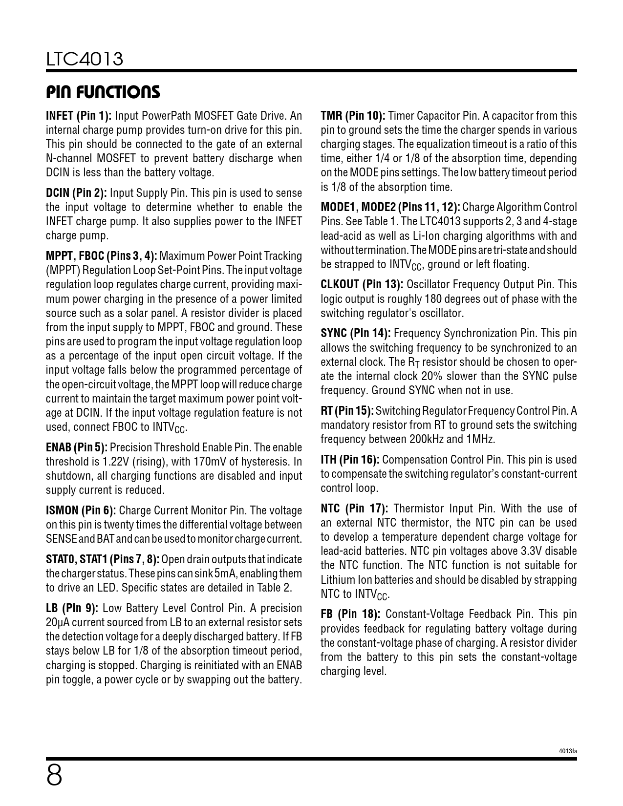 LTC4013 PIN FUNCTIONS INFET (Pin 1): Input PowerPath MOSFET Gate Drive. An TMR (Pin 10): Timer Capacitor Pin. A capacitor from this internal charge pump provides turn-on drive for this pin. pin to ground sets the time the charger spends in various This pin should be connected to the gate of an external charging stages. The equalization timeout is a ratio of this N-channel MOSFET to prevent battery discharge when time, either 1/4 or 1/8 of the absorption time, depending DCIN is less than the battery voltage. on the MODE pins settings. The low battery timeout period DCIN (Pin 2): Input Supply Pin. This pin is used to sense is 1/8 of the absorption time. the input voltage to determine whether to enable the MODE1, MODE2 (Pins 11, 12): Charge Algorithm Control INFET charge pump. It also supplies power to the INFET Pins. See Table 1. The LTC4013 supports 2, 3 and 4-stage charge pump. lead-acid as well as Li-Ion charging algorithms with and MPPT, FBOC (Pins 3, 4): Maximum Power Point Tracking without termination. The MODE pins are tri-state and should (MPPT) Regulation Loop Set-Point Pins. The input voltage be strapped to INTVCC, ground or left floating. regulation loop regulates charge current, providing maxi- CLKOUT (Pin 13): Oscillator Frequency Output Pin. This mum power charging in the presence of a power limited logic output is roughly 180 degrees out of phase with the source such as a solar panel. A resistor divider is placed switching regulator's oscillator. from the input supply to MPPT, FBOC and ground. These SYNC (Pin 14): Frequency Synchronization Pin. This pin pins are used to program the input voltage regulation loop allows the switching frequency to be synchronized to an as a percentage of the input open circuit voltage. If the external clock. The R input voltage falls below the programmed percentage of T resistor should be chosen to oper- ate the internal clock 20% slower than the SYNC pulse the open-circuit voltage, the MPPT loop will reduce charge frequency. Ground SYNC when not in use. current to maintain the target maximum power point volt- age at DCIN. If the input voltage regulation feature is not RT (Pin 15): Switching Regulator Frequency Control Pin. A used, connect FBOC to INTVCC. mandatory resistor from RT to ground sets the switching frequency between 200kHz and 1MHz. ENAB (Pin 5): Precision Threshold Enable Pin. The enable threshold is 1.22V (rising), with 170mV of hysteresis. In ITH (Pin 16): Compensation Control Pin. This pin is used shutdown, all charging functions are disabled and input to compensate the switching regulator’s constant-current supply current is reduced. control loop. ISMON (Pin 6): Charge Current Monitor Pin. The voltage NTC (Pin 17): Thermistor Input Pin. With the use of on this pin is twenty times the differential voltage between an external NTC thermistor, the NTC pin can be used SENSE and BAT and can be used to monitor charge current. to develop a temperature dependent charge voltage for lead-acid batteries. NTC pin voltages above 3.3V disable STAT0, STAT1 (Pins 7, 8): Open drain outputs that indicate the NTC function. The NTC function is not suitable for the charger status. These pins can sink 5mA, enabling them Lithium Ion batteries and should be disabled by strapping to drive an LED. Specific states are detailed in Table 2. NTC to INTVCC. LB (Pin 9): Low Battery Level Control Pin. A precision FB (Pin 18): Constant-Voltage Feedback Pin. This pin 20µA current sourced from LB to an external resistor sets provides feedback for regulating battery voltage during the detection voltage for a deeply discharged battery. If FB the constant-voltage phase of charging. A resistor divider stays below LB for 1/8 of the absorption timeout period, from the battery to this pin sets the constant-voltage charging is stopped. Charging is reinitiated with an ENAB charging level. pin toggle, a power cycle or by swapping out the battery. 4013fa 8